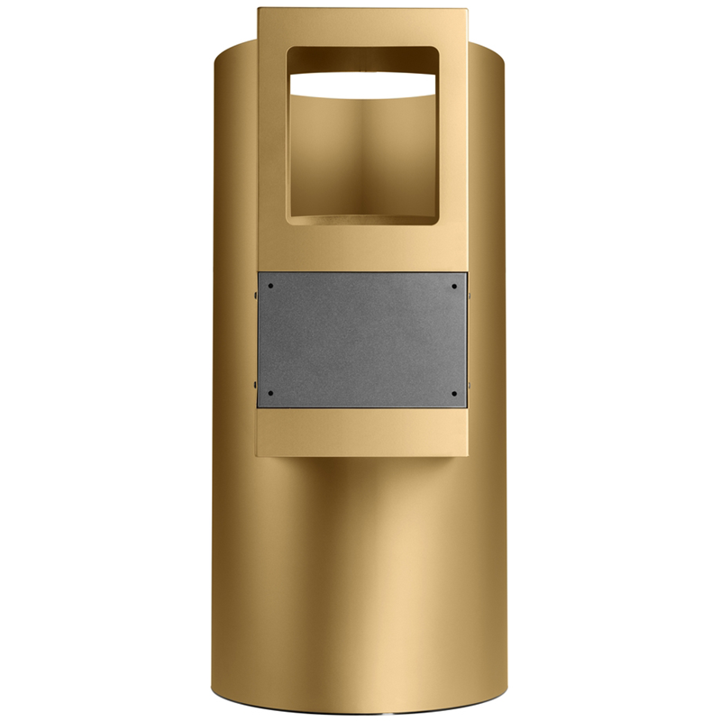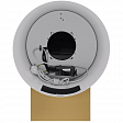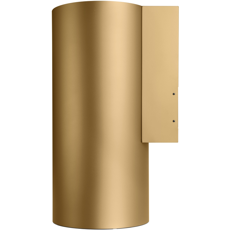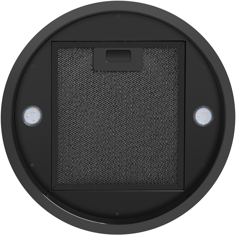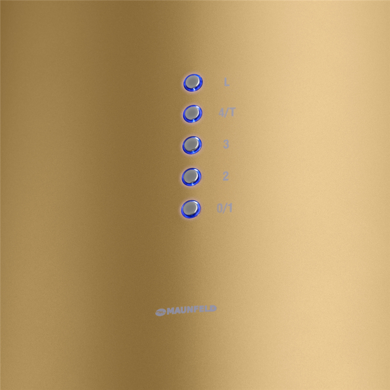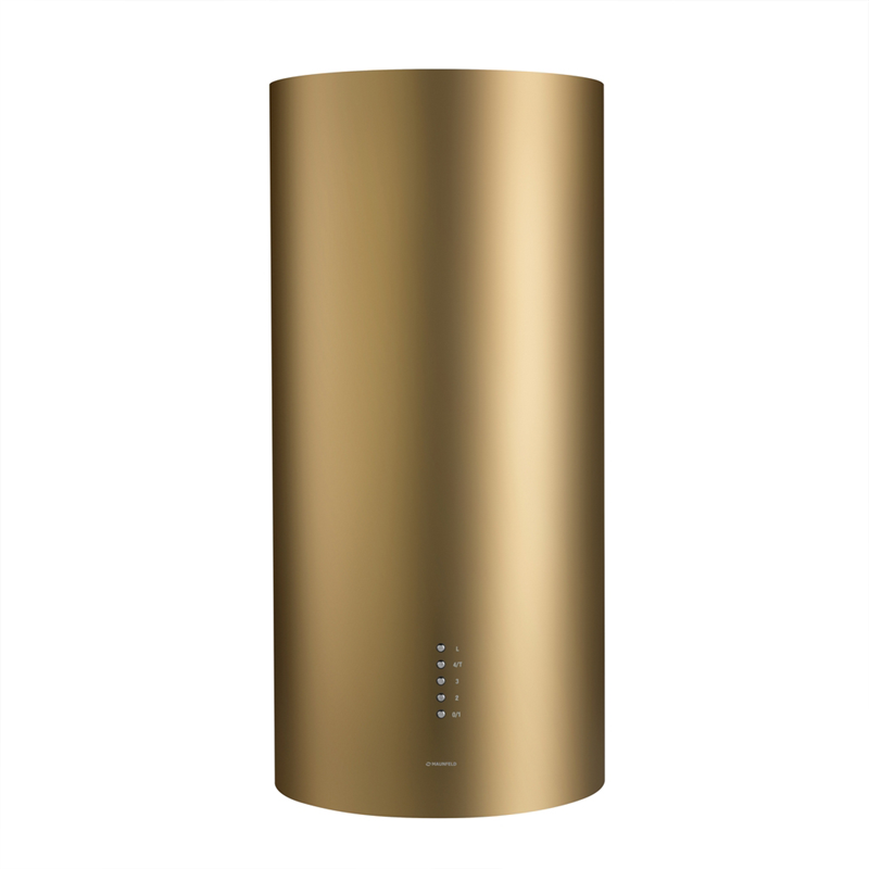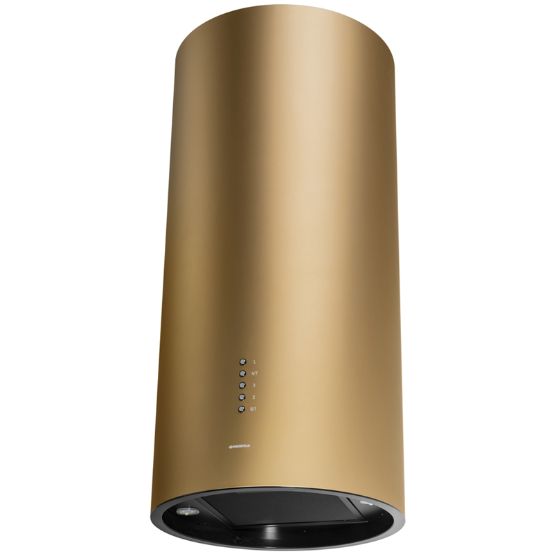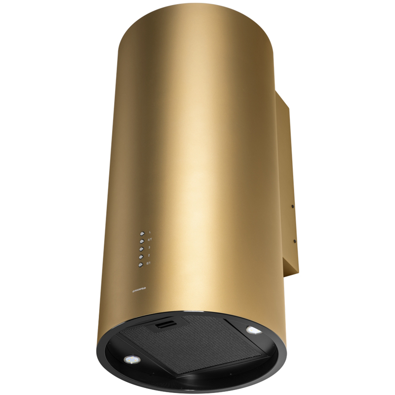 Корпус цилиндрической формы, сделанный из нержавеющей стали с термостойким покрытием цвета матового золота, монтируется на стену над варочной поверхностью. Нижний торец вытяжки выполнен в черном акцентном цвете. Специальный многослойный жироулавливающий фильтр легко снимается и полностью разбирается, что сильно упрощает его чистку.