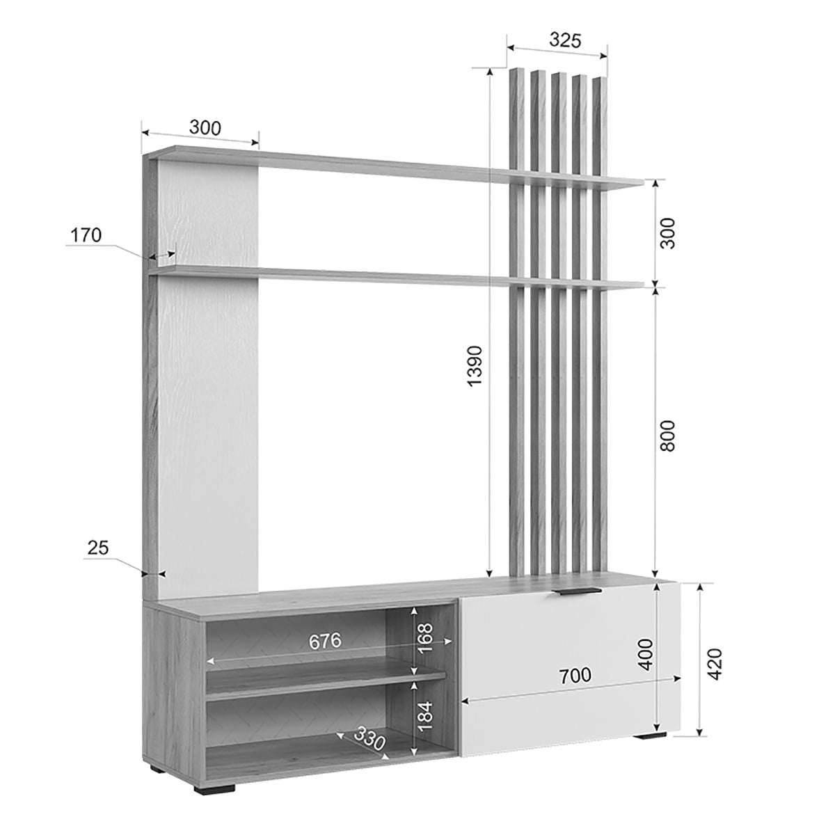 Гостиная "Бери"- это закрытые и открытые секции, место для ТВ с диагональю до 55 дюймов и декоративными полками для ценных и важных мелочей.