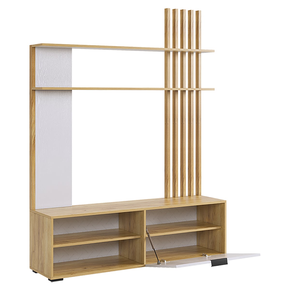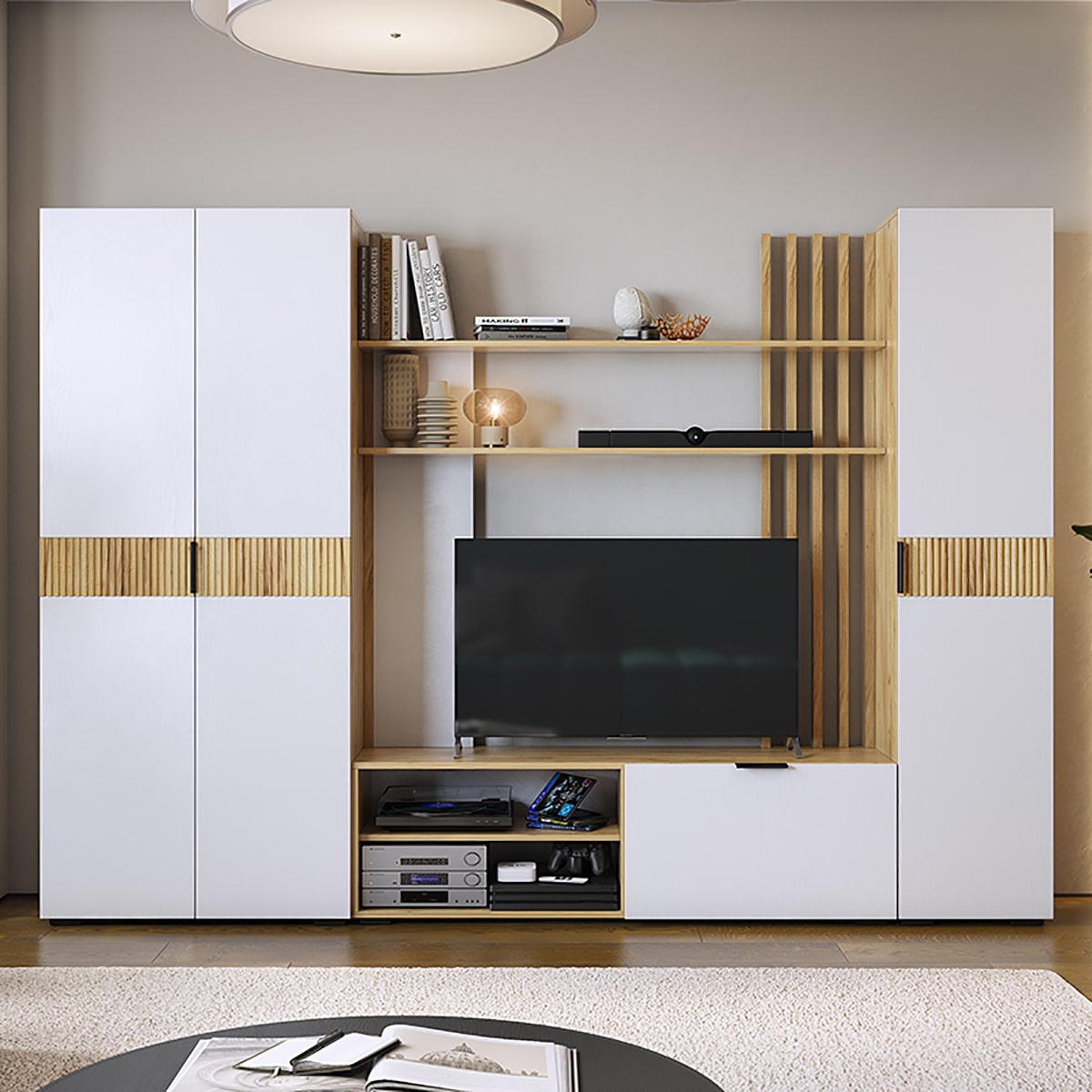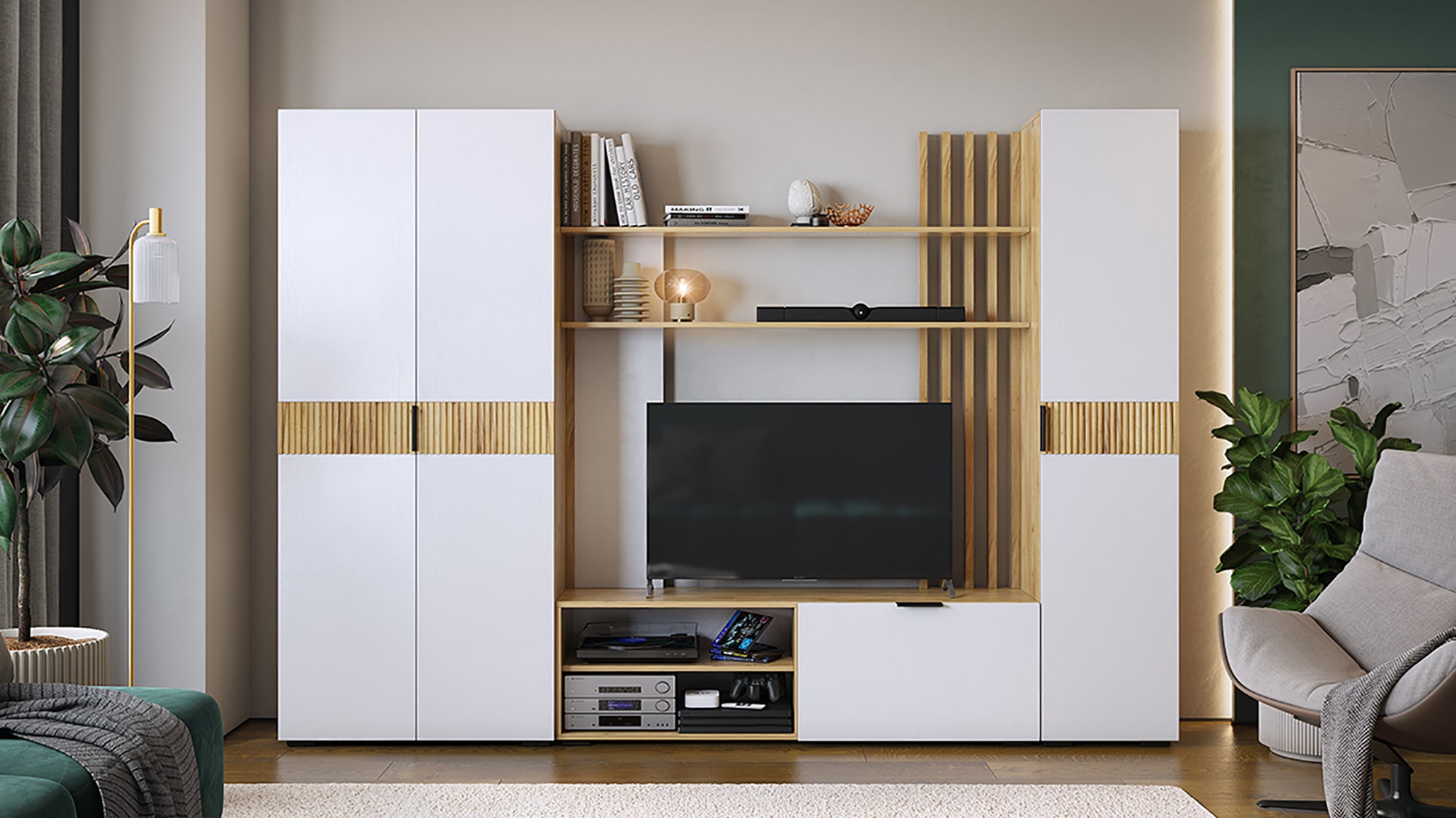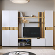 Гостиная "Бери"- это закрытые и открытые секции, место для ТВ с диагональю до 55 дюймов и декоративными полками для ценных и важных мелочей.