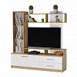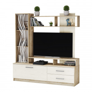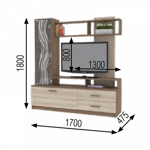 Гостиная Дарья – это компактная стенка, которая ничем не уступает по вместительности большим гарнитурам. На стеклянном фасаде стеллажа нанесен интересный волнообразный орнамент.