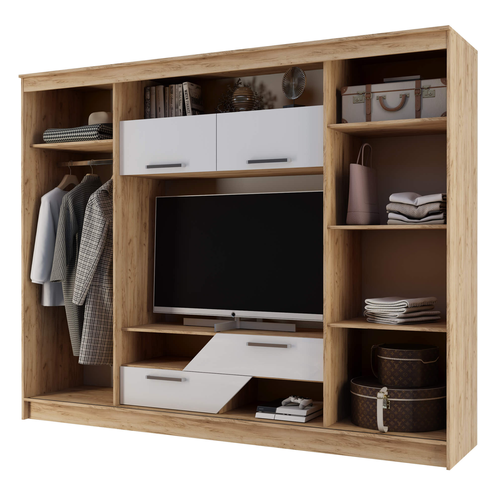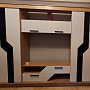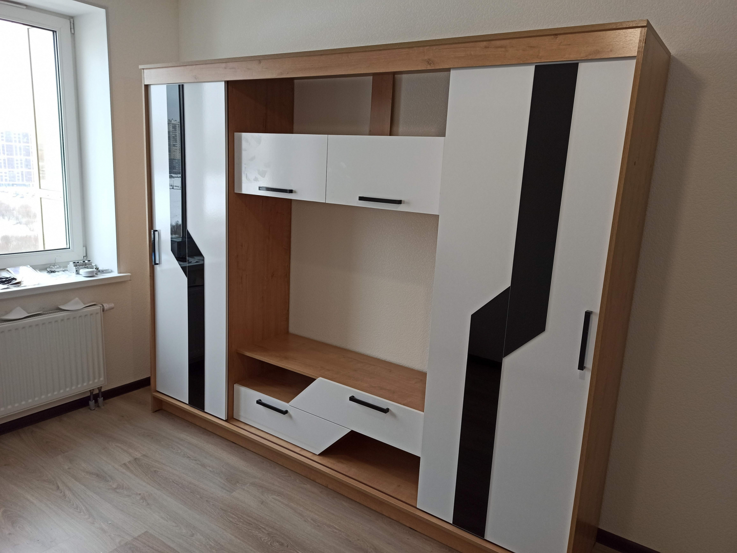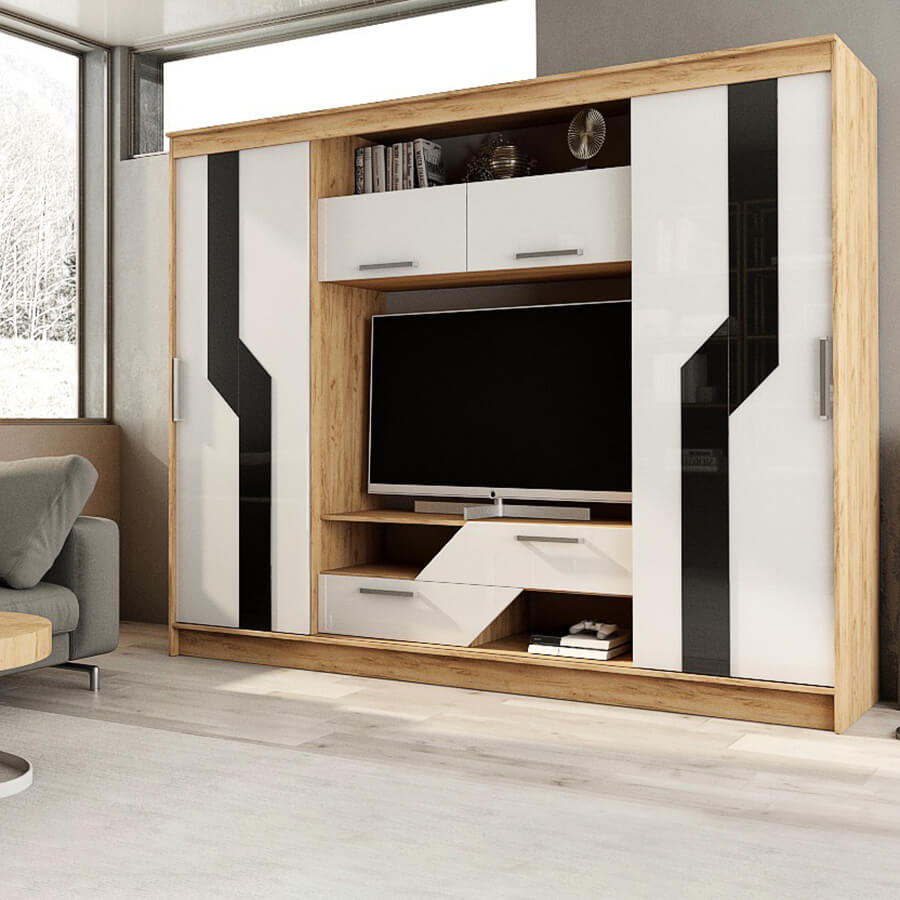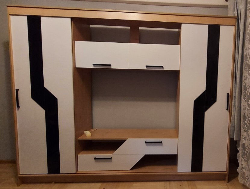 Гостиная оснащена раздвижными и откидными дверями, что обеспечивает удобный доступ к содержимому шкафа. Полки позволяют разместить большое количество вещей.