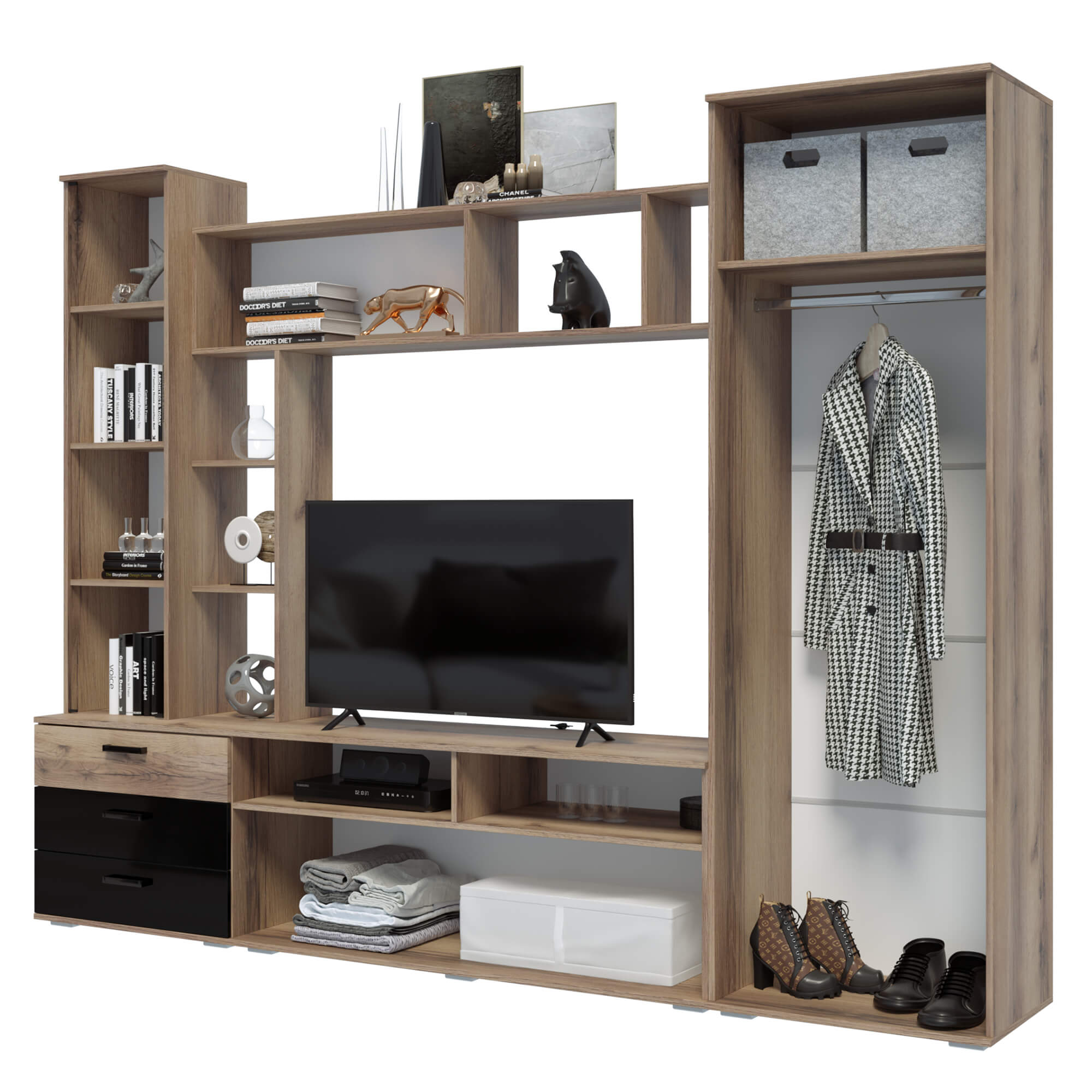 Стенка Крокус не только стильная и современная, но и функциональная гостиная. Здесь отлично смотрится большой телевизор, имеются отделения для хранения аппаратуры, дисков, журналов, в стеллаже прекрасно разместятся любимые книги, а на полках есть место декоративным мелочам и фотографиям. Кроме этого, достоинством модели является вместительный шкаф со штангой и полкой для одежды.