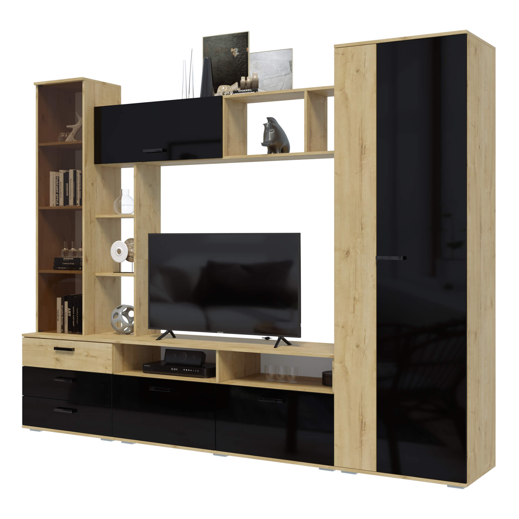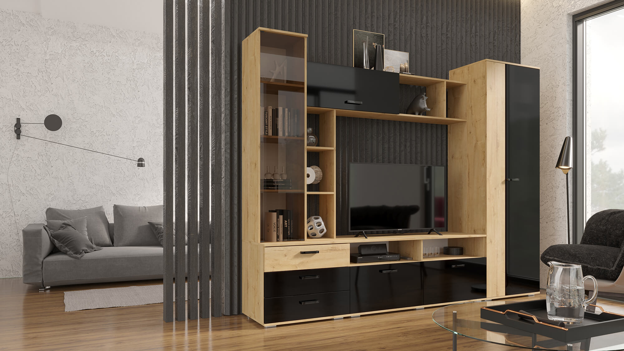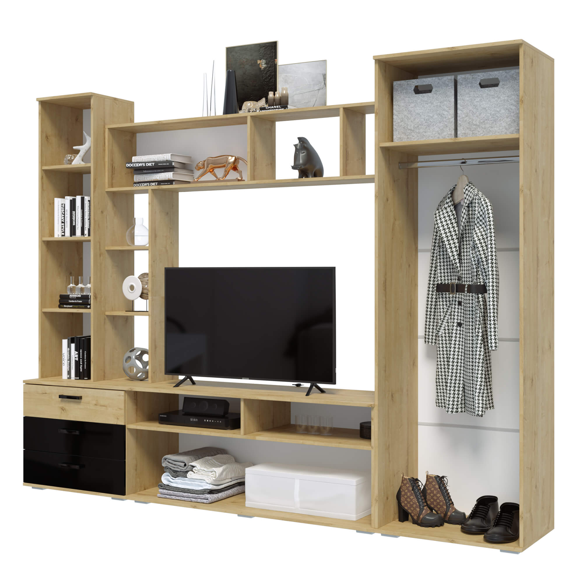 Стенка Крокус не только стильная и современная, но и функциональная гостиная. Здесь отлично смотрится большой телевизор, имеются отделения для хранения аппаратуры, дисков, журналов, в стеллаже прекрасно разместятся любимые книги, а на полках есть место декоративным мелочам и фотографиям. Кроме этого, достоинством модели является вместительный шкаф со штангой и полкой для одежды.