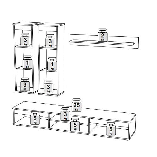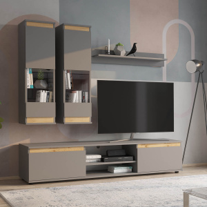 В комплект входит: полка навесная, шкаф витрина навесной (2 шт), тумба под ТВ.