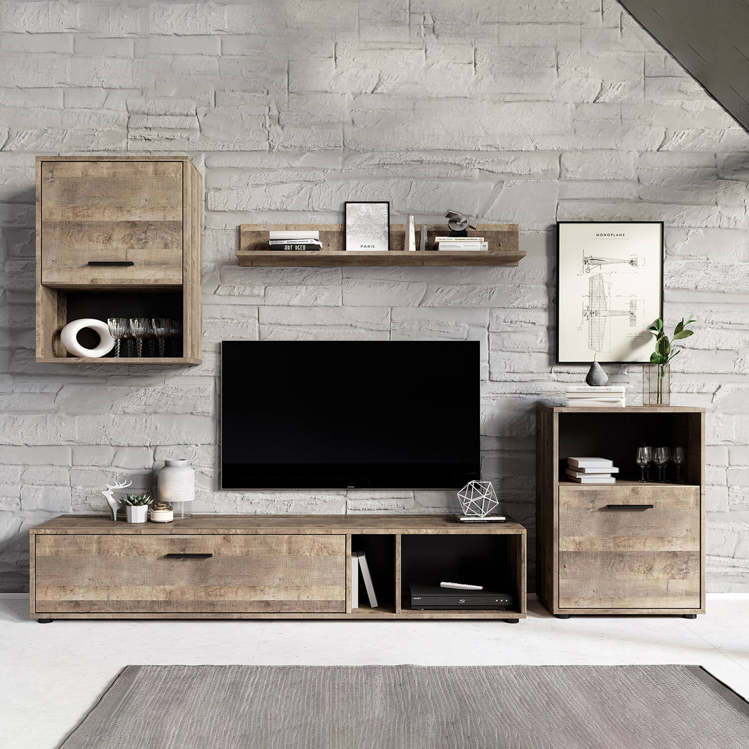 В комплект входят четыре предмета мебели: подвесной и стоячий шкафы, а также тумба под ТВ и полка. Размеры каждого предмета варьируются от 160 см в ширину до 36 см в глубину.