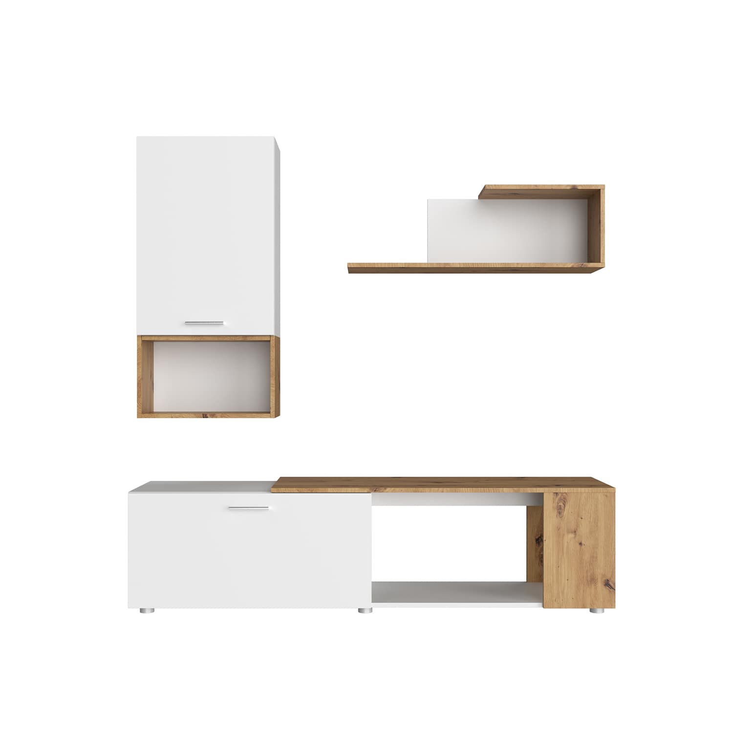 В комплект гостиной входят навесная полка, шкаф с полкой и тумба под ТВ, что позволяет максимально эффективно использовать пространство и организовать хранение различных предметов.