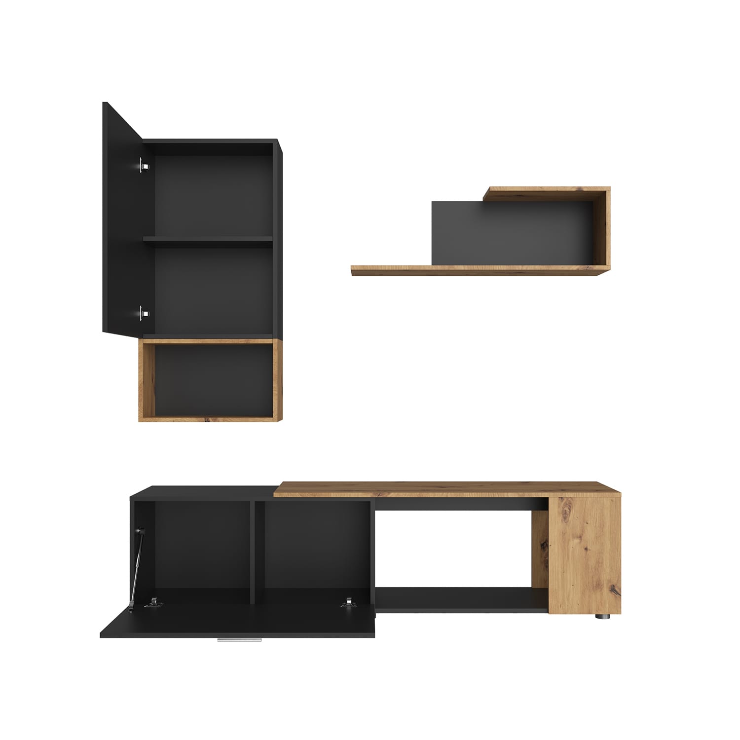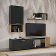 В комплект гостиной входят навесная полка, шкаф с полкой и тумба под ТВ, что позволяет максимально эффективно использовать пространство и организовать хранение различных предметов.