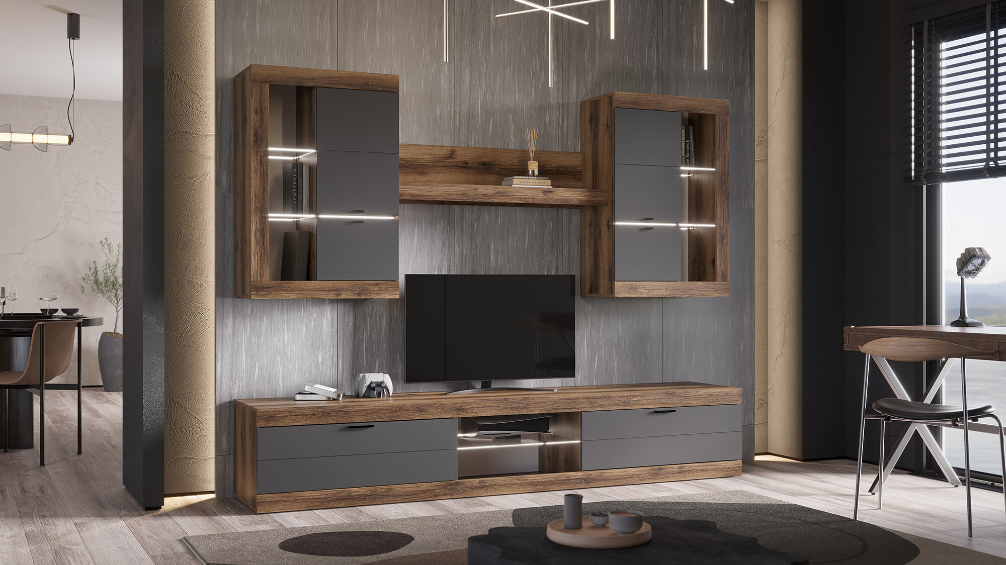 Создать комфортную и красивую гостиную — это искусство, которое требует внимания к каждой детали. Сочетание Дуба Делано с цветом Графит делает мебель одновременно строгой и лаконичной, при этом стильной и уютной, а что самое важное – серый цвет универсальный и классический. Он подходит к любому стилю и сочетается со всей цветовой палитрой.