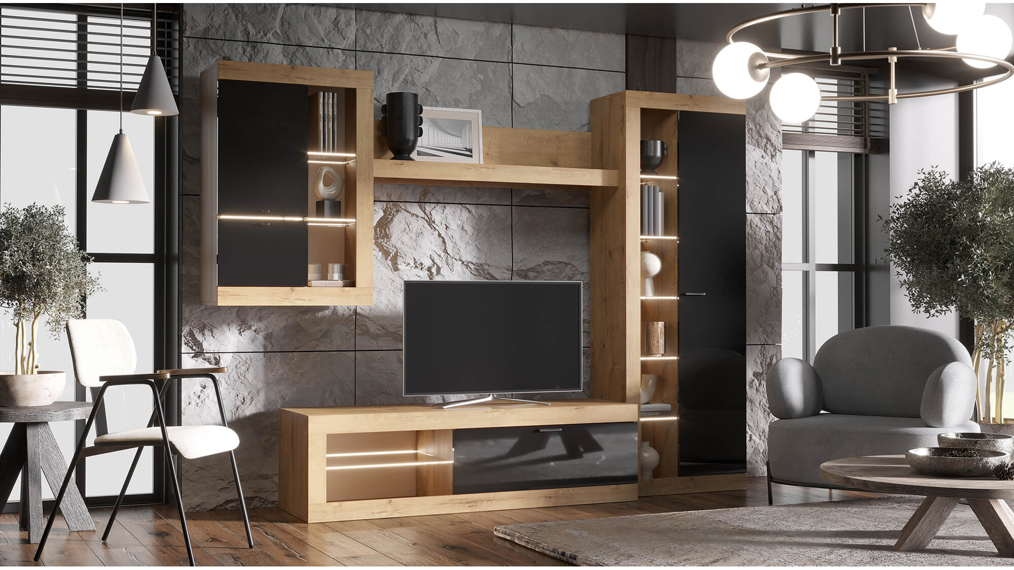 Создать комфортную и красивую гостиную — это искусство, которое требует внимания к каждой детали. Сочетание Дуба Вотан с чёрным глянцем делает мебель одновременно строгой и лаконичной, при этом стильной и уютной, а что самое важное – черный цвет универсальный и классический. Он подходит к любому стилю и сочетается со всей цветовой палитрой.