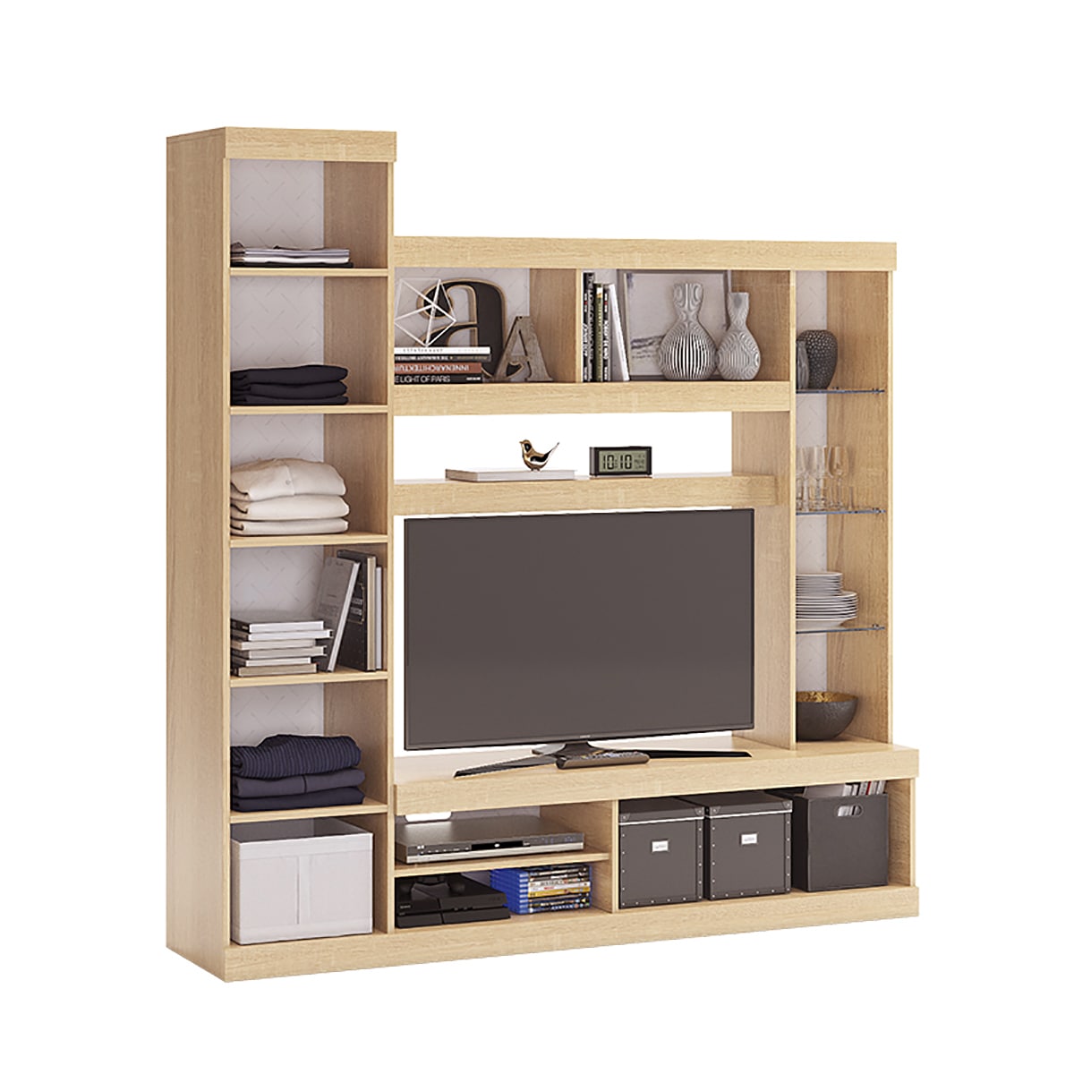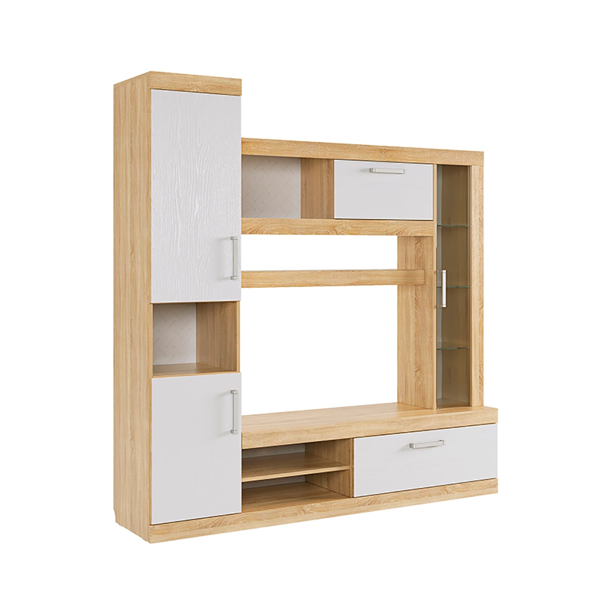 Цвет стенки представлен в комбинации дуба сонома и белого дерева, что придает ей элегантный и современный вид. Материал корпуса - ЛДСП, обеспечивающий прочность и долговечность мебели.