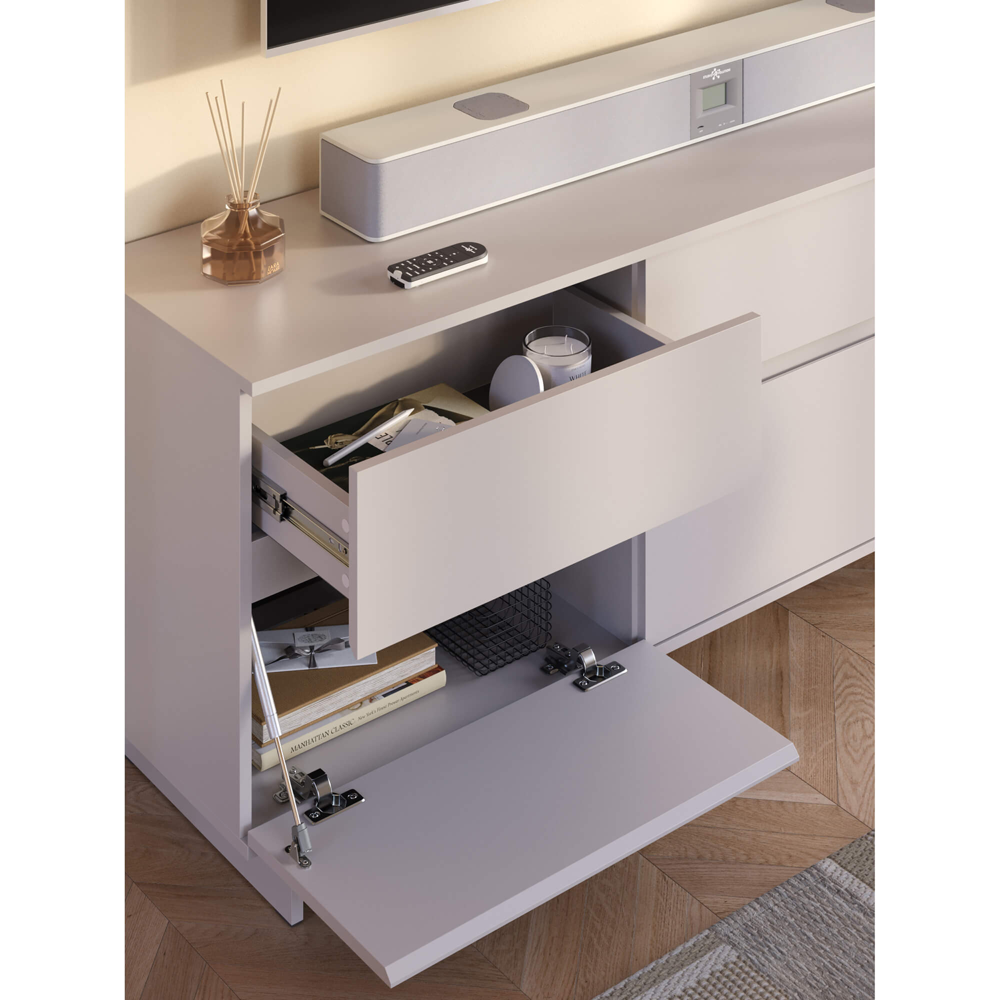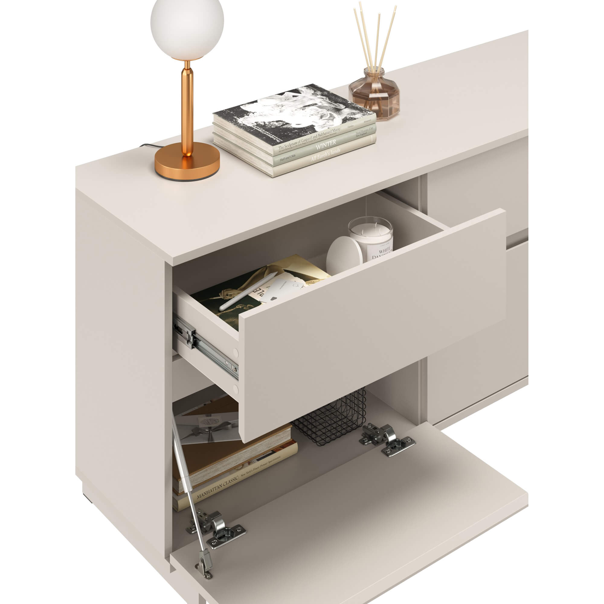 Открывание: интегрированная в фасад ручка(без лицевой фурнитуры).