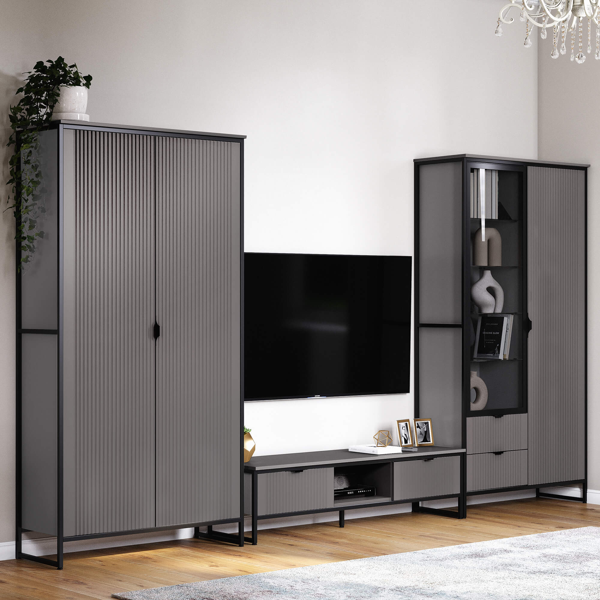Коллекцию модульной гостиной "Нора" отличает современный оригинальный стиль. Декоративная продольная фрезеровка на фазадах из МДФ и опоры на металлокаркасе цвета соответствуют модным тенденциям этого года в ведущих зарубежных коллекциях.