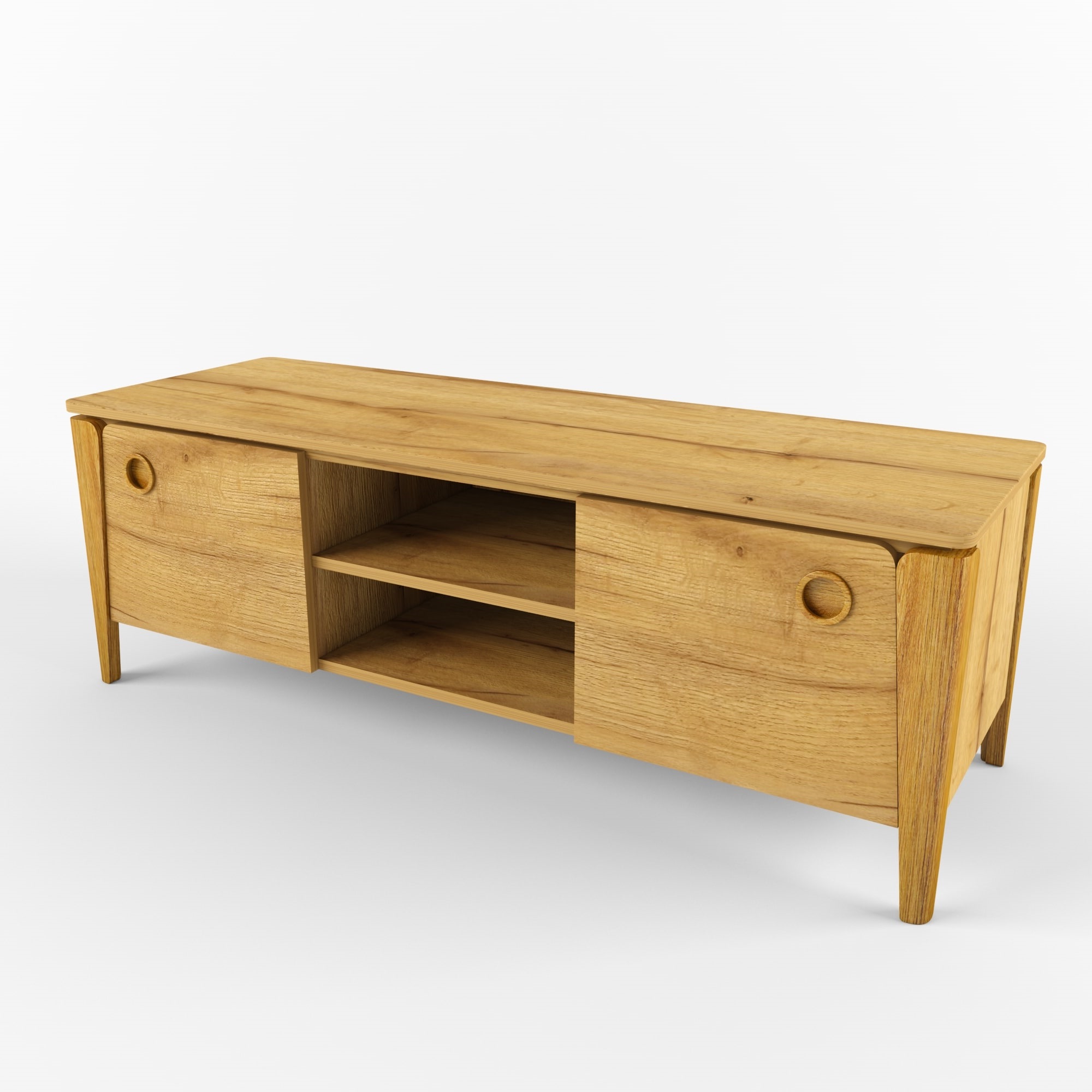Тумба под ТВ богатой фактурой золотистого дуба. Стильные врезные ручки и декоративные закругленные накладки из натурального дуба. Петли с доводчиками обеспечат тишину и плавность закрывания.