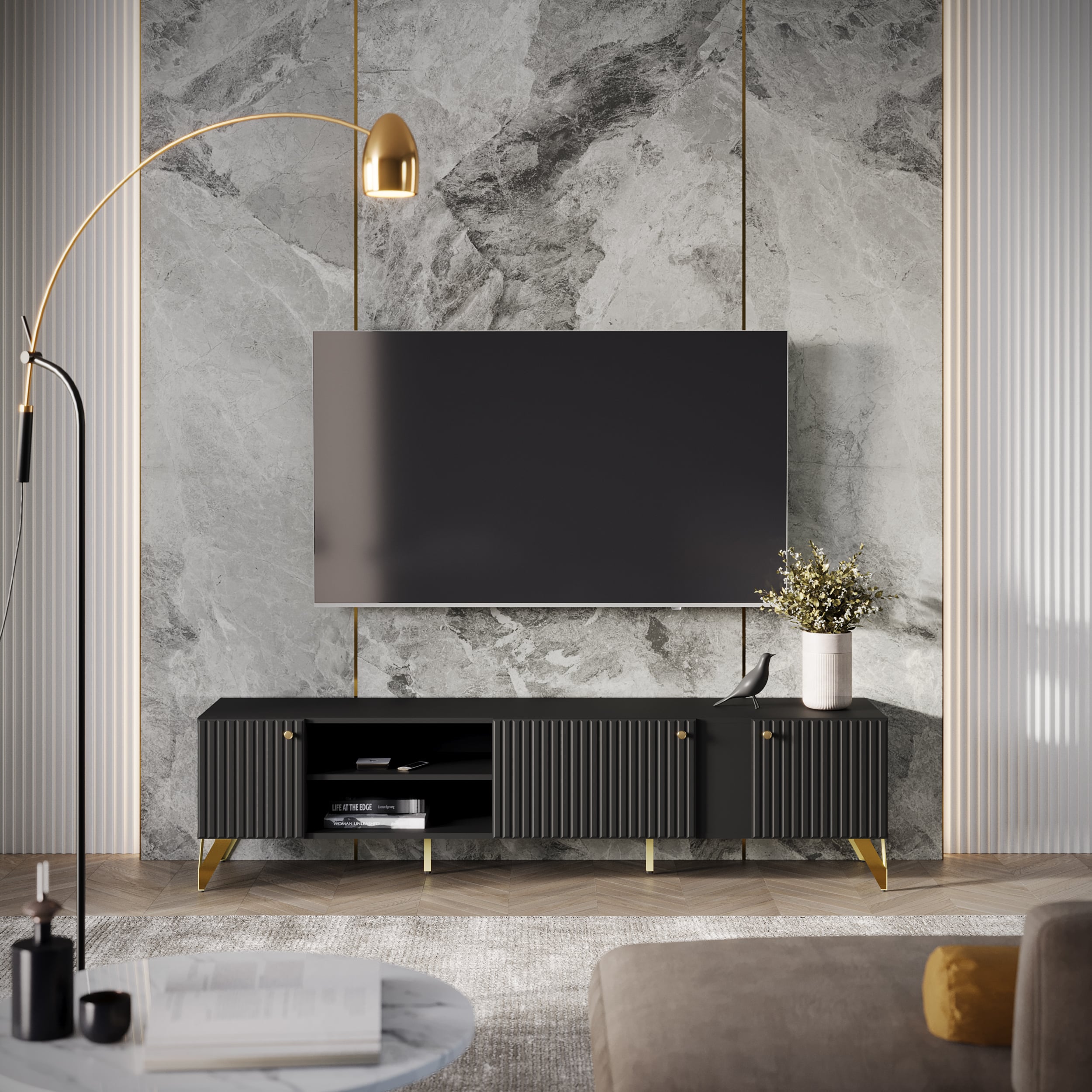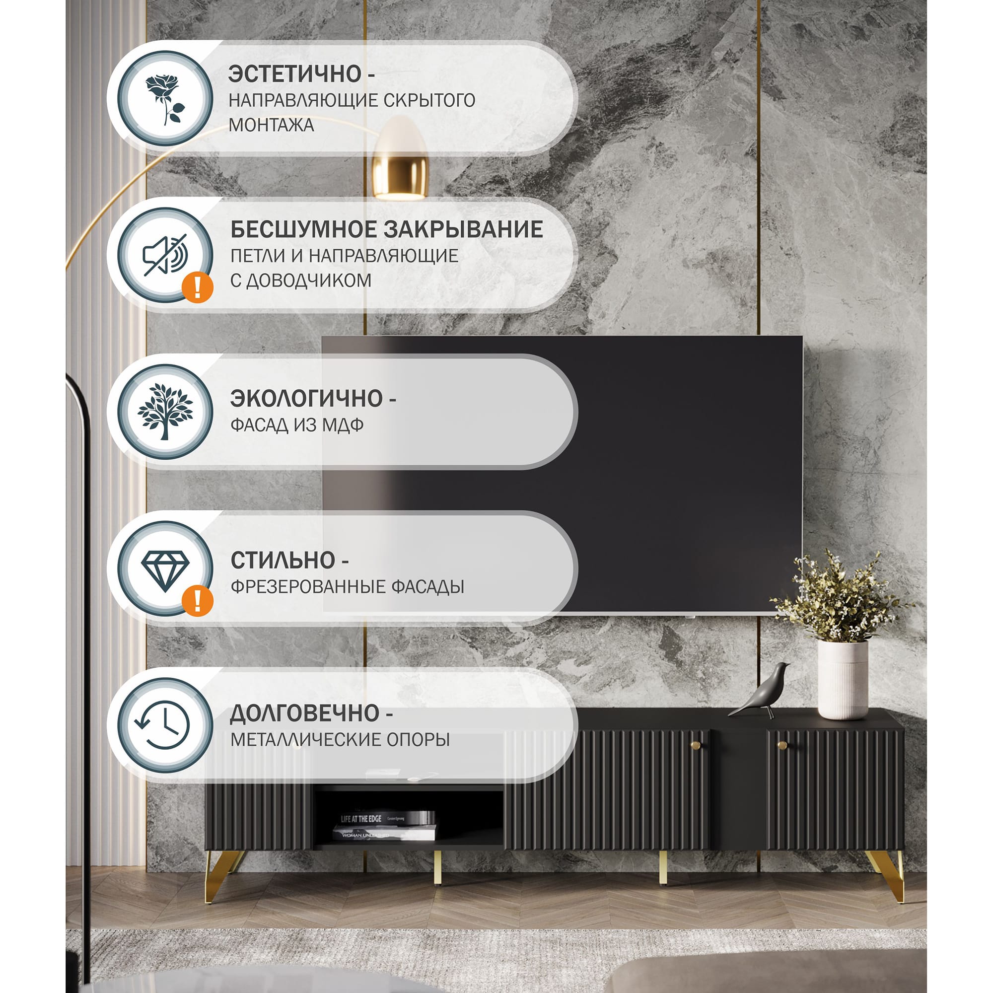 Универсальный черный цвет - тумба впишется в любой интерьер. Три вместительные секции за распашными дверями, открытая ниша с полкой - максимальная вместительность. Петли с доводчиком - бесшумное закрывание. Регулируемые опоры - позволяет выставить идеально ровно. Фасады МДФ - экологично. Фрезеровка на фасаде - красиво и современно. Высота опоры 150 мм - удобно для уборки.