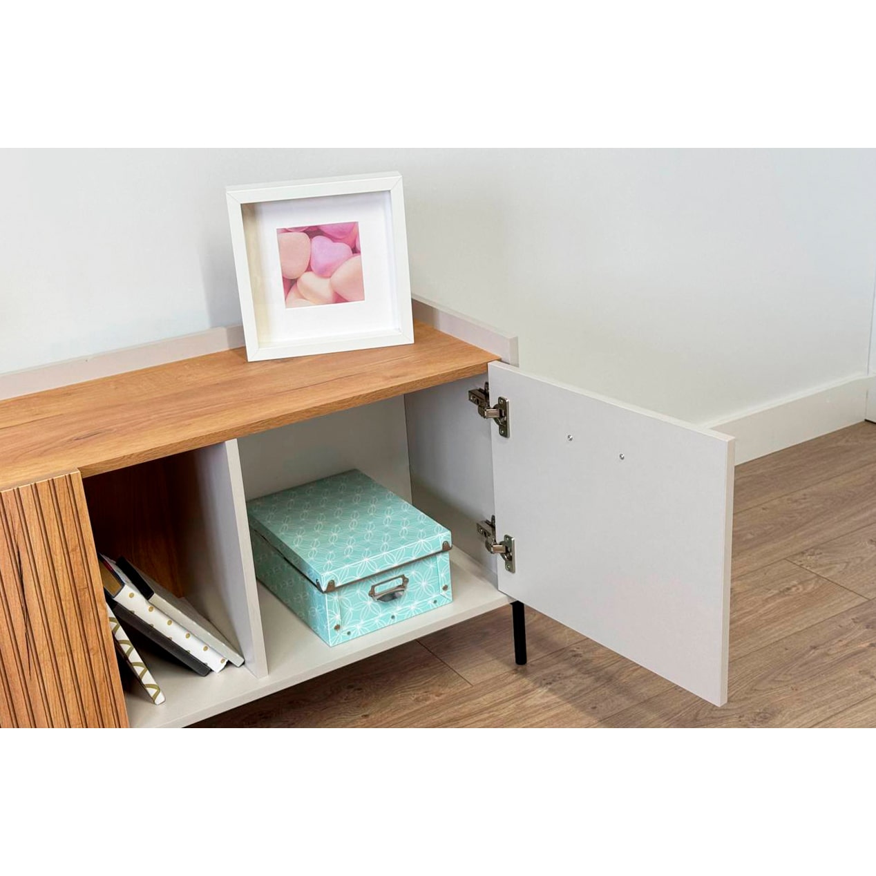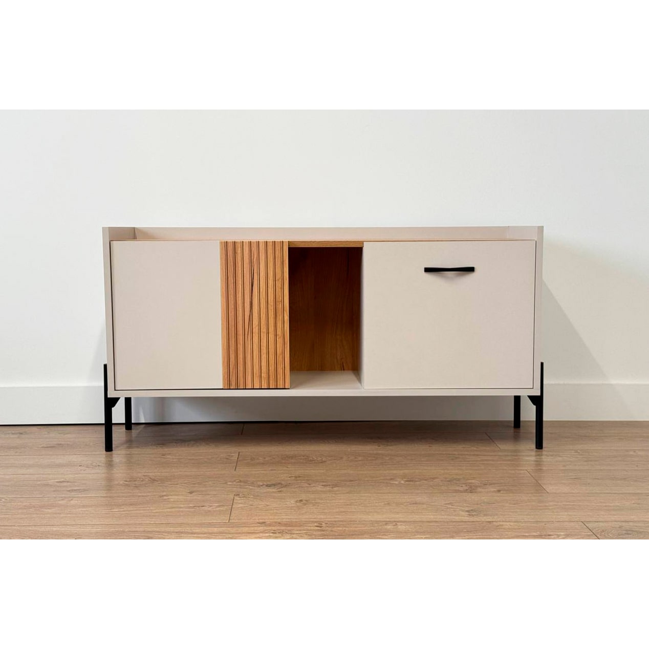 Стильная металлическая ручка придает тумбе современный и модный вид. Открытая ниша обеспечивает легкий доступ к вещам, которые вы используете часто, или может служить пространством для размещения медиа-устройств.