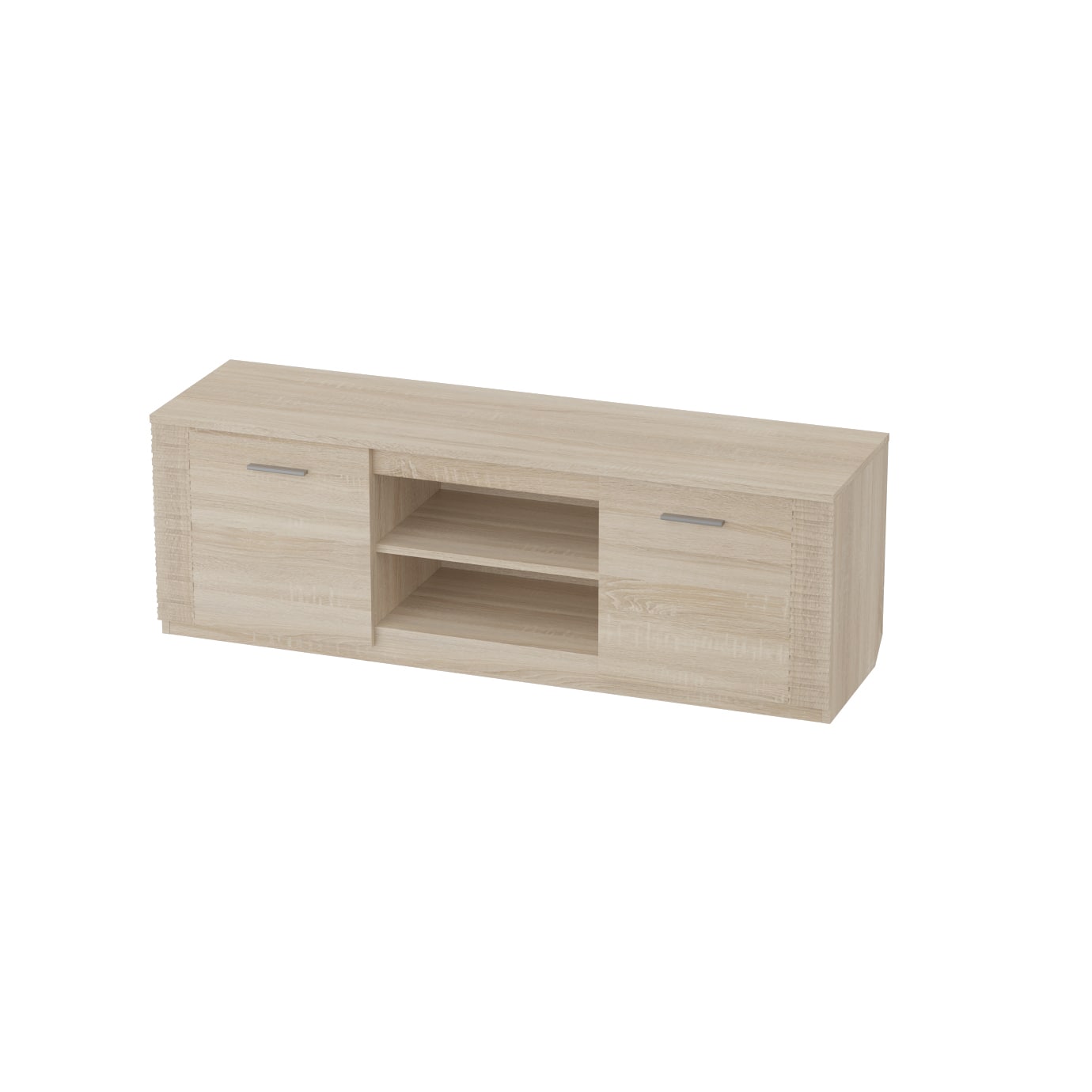 Тумба по ТВ имеет две ниши, закрытые дверцами и центральная открытая с одной съёмной полкой.