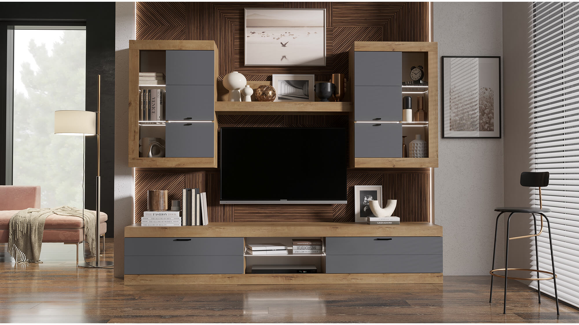 Графит – это классический выбор для сочетания с Дубом Вотан. Он создает яркий контраст, который подчеркивает глубину и насыщенность цвета.