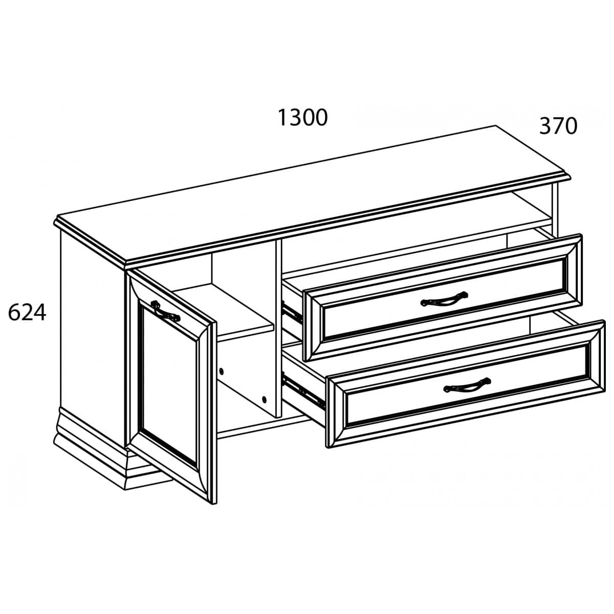 Тумба RTV 1D2SN Тиффани даёт возможность разместить технику выше, чем на тумбе RTV 2S2N. Тумба RTV 1D2SN – прямая. Имеет под верхним щитом открытую нишу (N) для расположения других видов техники небольших размеров, два выдвижных ящика (2S) для хранения мелких предметов (пульты, провода, батарейки, а также газеты, журналы, фотоальбомы и другие вещи), за глухой дверью – отделение с полкой (1D). Дверь распашная, крепится на петлях к боковине.