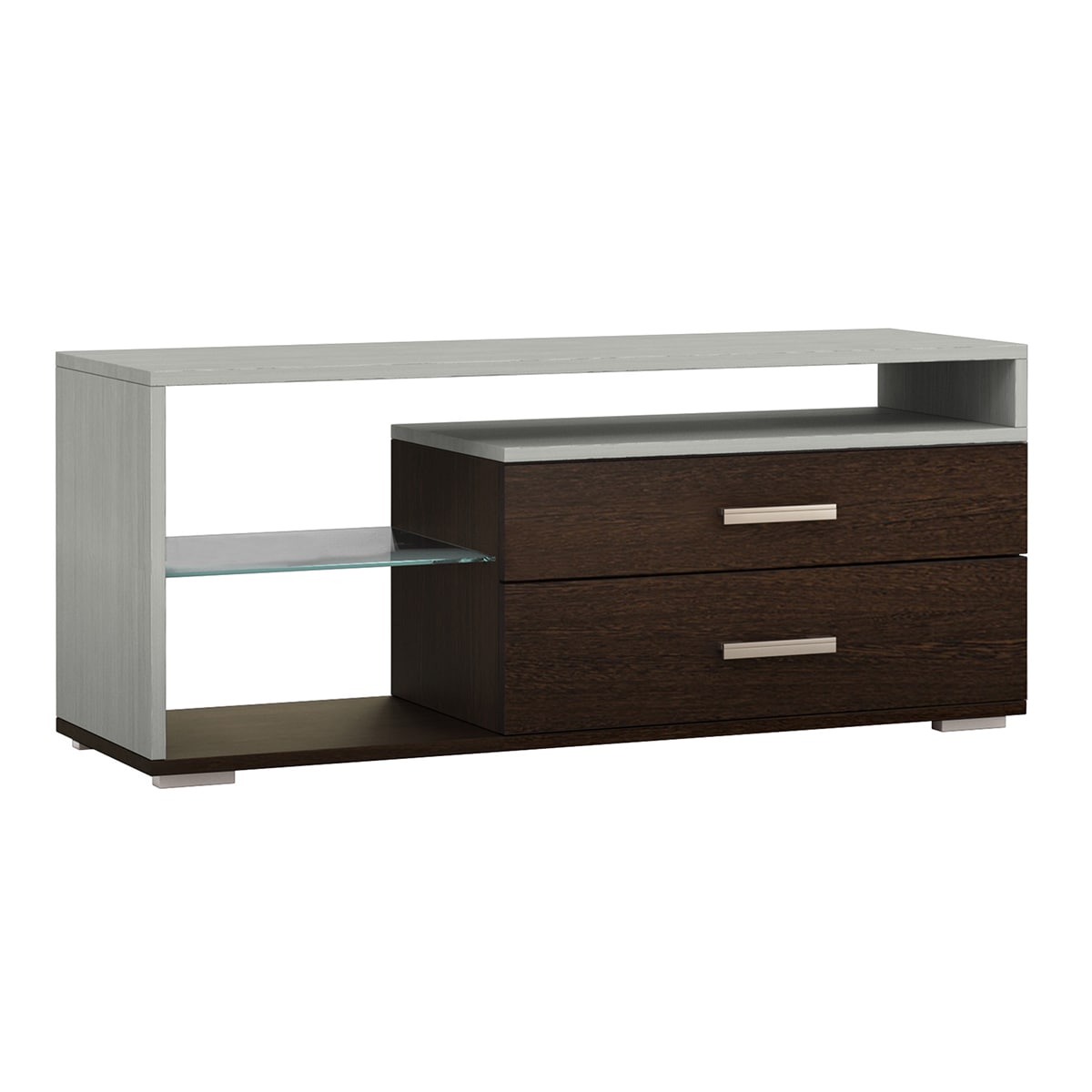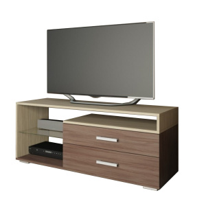 Тумба TV 2 имеет два выдвижных ящика, нишу для аппаратуры, стеклянную полку. Ее современный стиль и контрастное сочетание цветов помогут создать неповторимый стиль в гостиной.