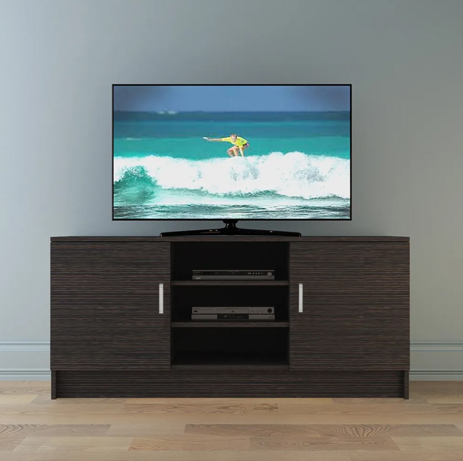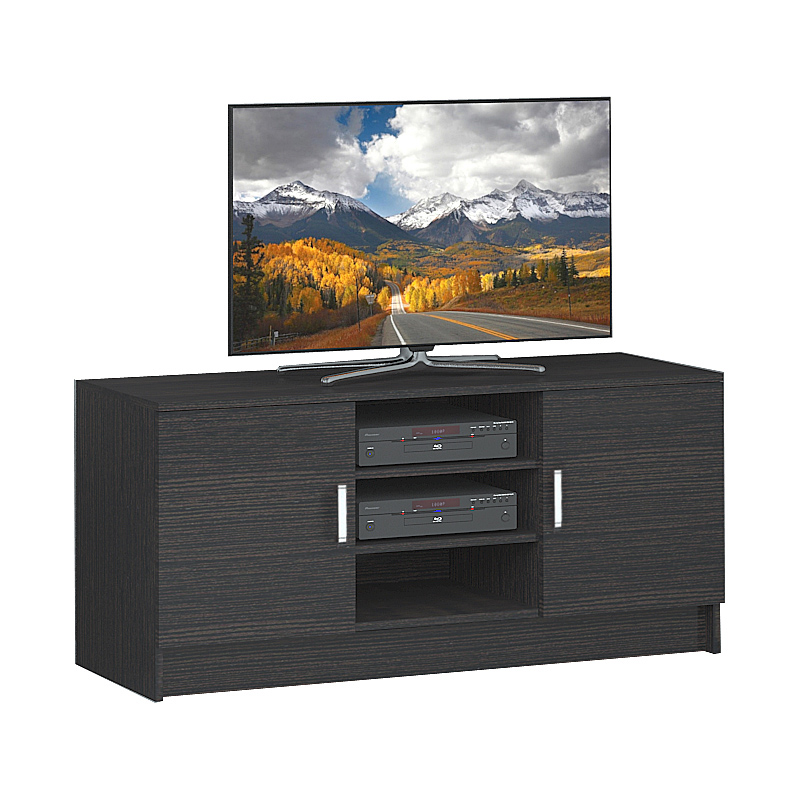 Тумба оснащена двумя отсеками с дверцами, что позволяет удобно хранить различную бытовую технику, такую как проигрыватели, ресиверы и усилители.