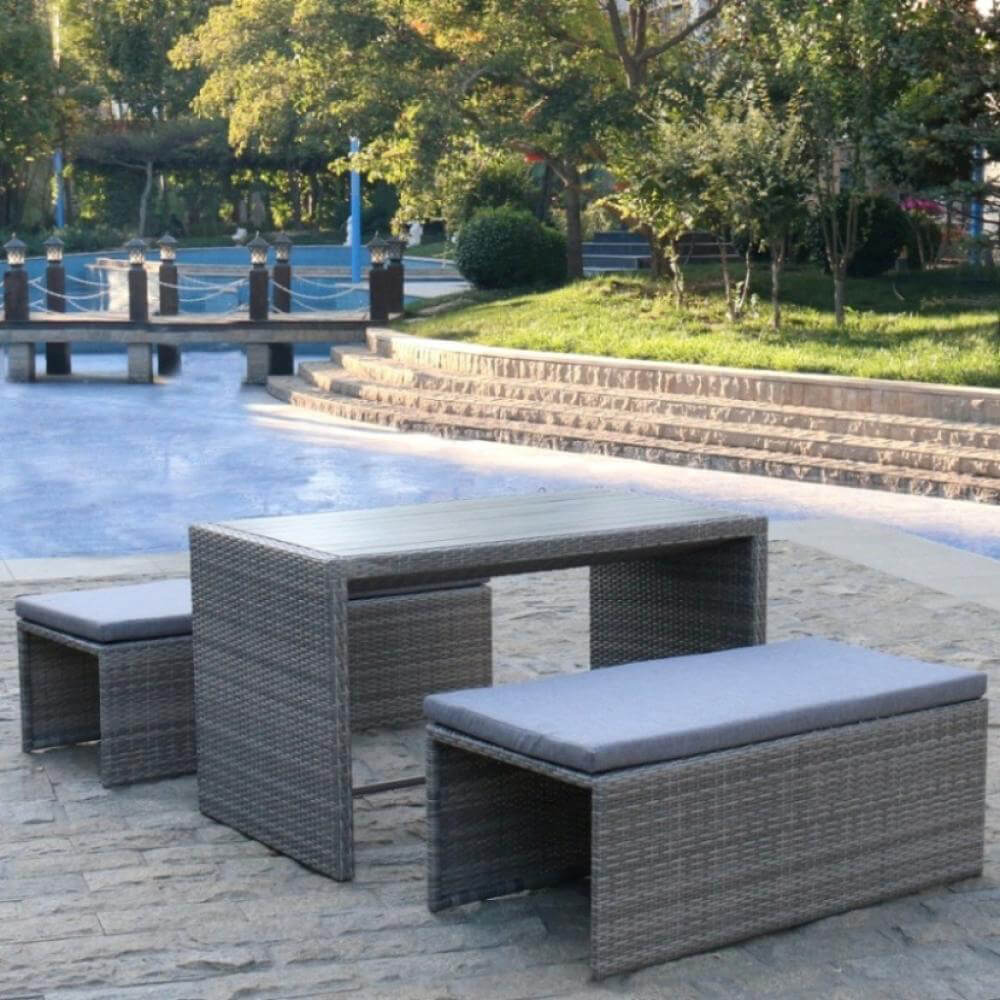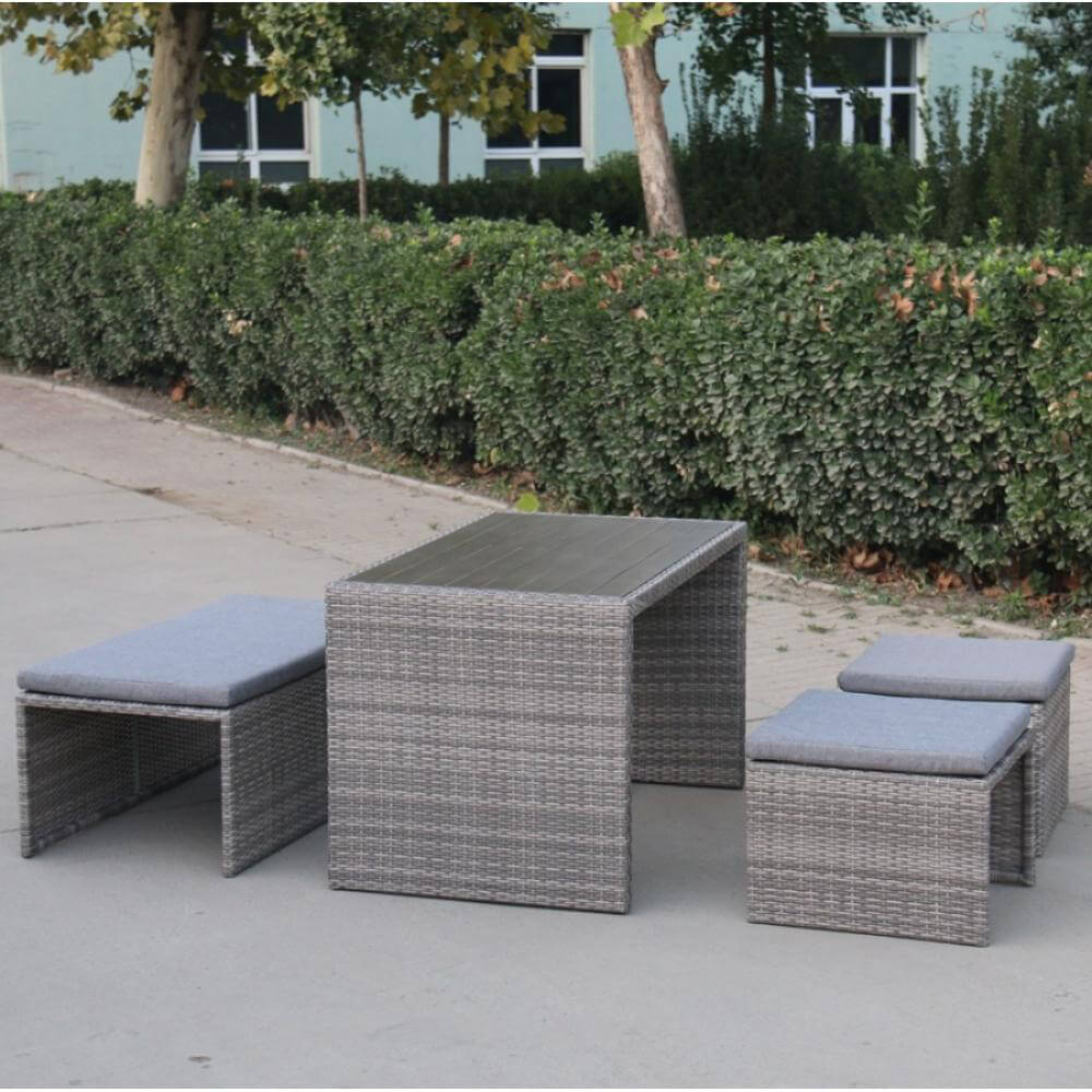 В составе комплекта: диван, который трансформируется в обеденную группу: стол, лавочка и 2 пуфа. Высококачественная лоза из полиротанга серого цвета стойкая к любым атмосферным явлениям. Крепкий стальной каркас с полимерным антивандальным покрытием и отличным качеством сварки. Изделие сплетено вручную мастерами под жестким контролем качества на каждом этапе производства. Лоза максимально приближена по рельефу и текстуре к естественному материалу. Идеально подходит для использования на улице и внутри помещения в любую погоду. Не боится воды, солнца и минусовой температуры. Подушки входят в комплект.