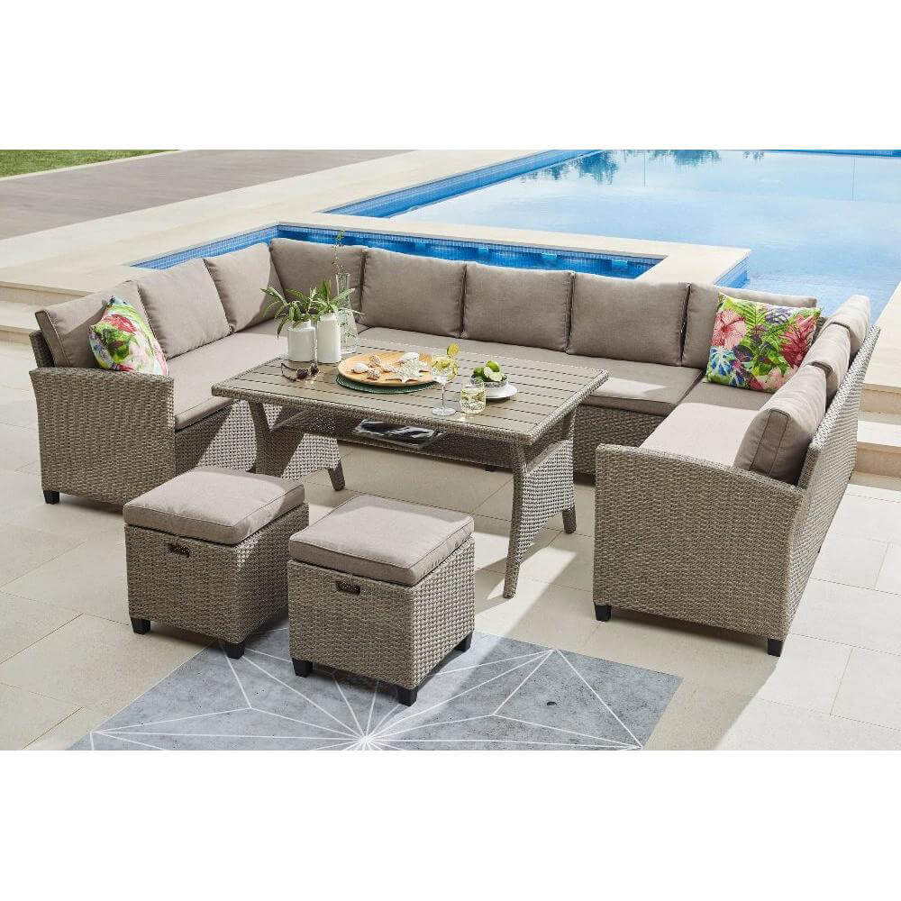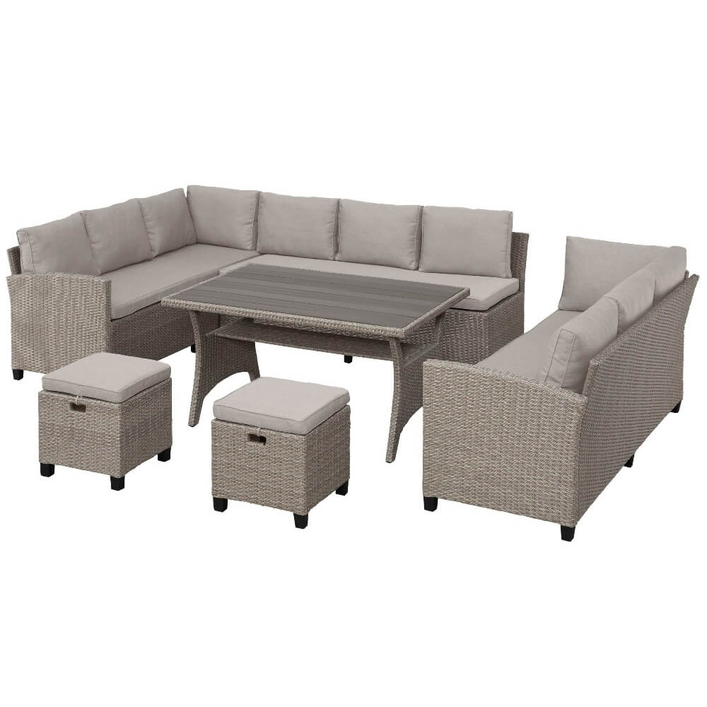 В составе комплекта: 3 дивана, стол и 2 пуфа. Высококачественная лоза из полиротанга бежевого цвета стойкая к любым атмосферным явлениям. Крепкий стальной каркас с полимерным антивандальным покрытием и отличным качеством сварки. Изделие сплетено вручную мастерами под жестким контролем качества на каждом этапе производства. Лоза максимально приближена по рельефу и текстуре к естественному материалу. Идеально подходит для использования на улице и внутри помещения в любую погоду. Не боится воды, солнца и минусовой температуры. Диваны можно скрепить между собой скобами или раздвинуть друг от друга.