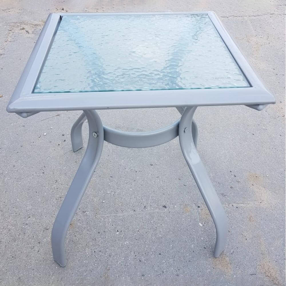 Удобный маленький столик для шезлонгов. Цвет: серый. Каркас: сталь. Столешница: закаленное стекло прозрачного цвета.