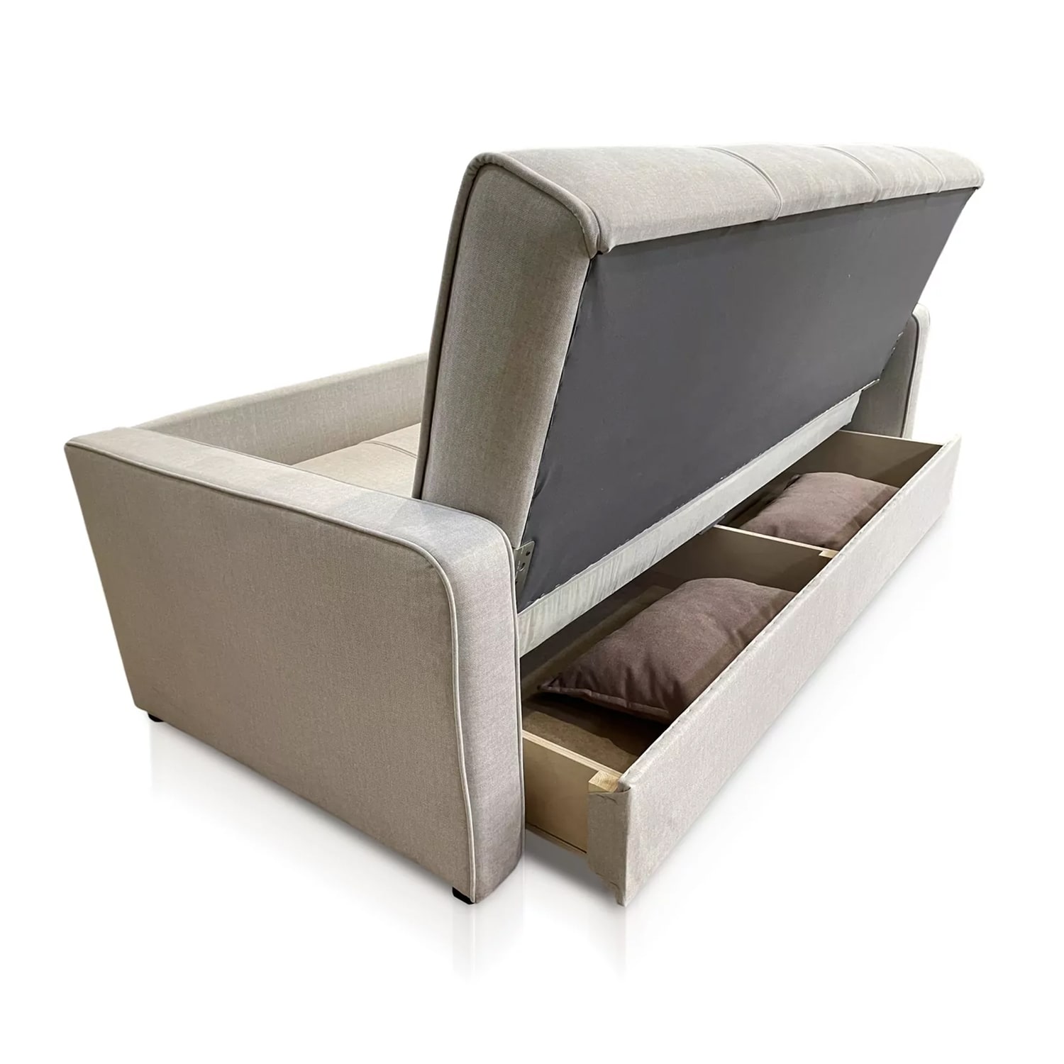 Под всей шириной сиденья установлен вместительный ящик для постельных принадлежностей из eco-березовой фанеры 15 мм.