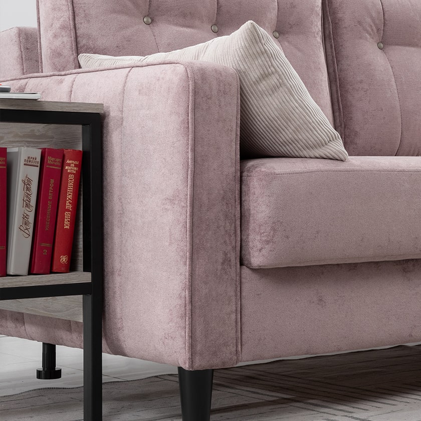 Подушки имеют трапециевидную форму, с утолщением к низу для комфорта посадки. Кант по всему периметру подушек, декоративные утяжки металлическими пуговицами, вертикальная стежка.