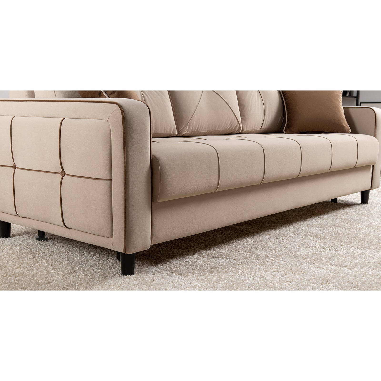Модный диван "Черри Н" порадуют поклонников современного стиля. Контрастные канты, пуговицы и декоративные подушки делают этот диван ярким акцентом интерьера.
