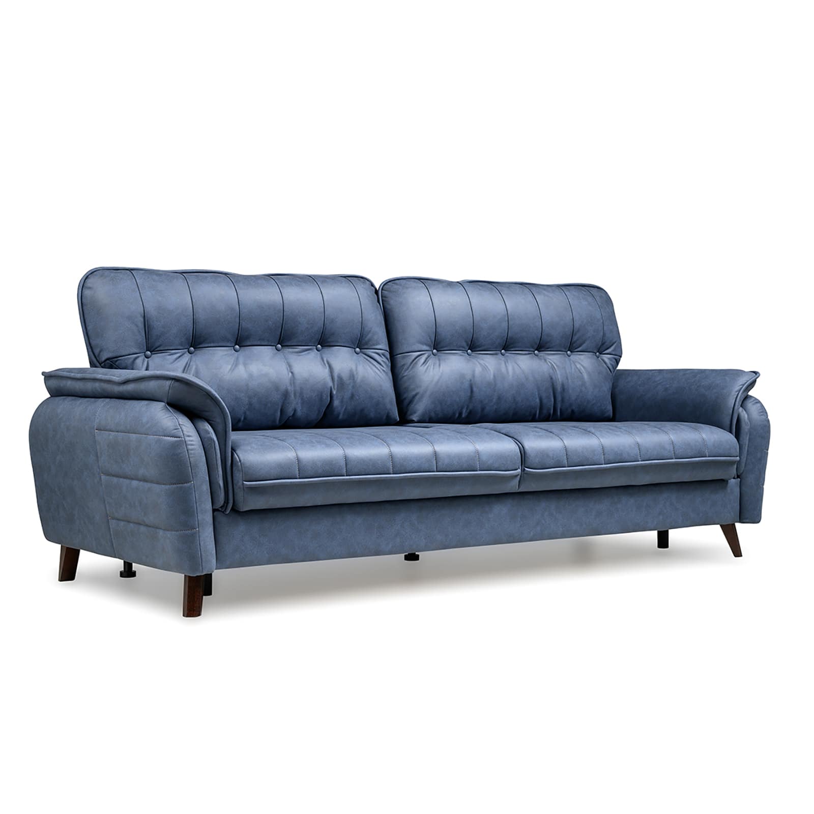 Декоративные канты на подушках дивана, подлокотниках и сиденье. Стежка на передней части сиденья и внешней части подлокотника. Защипы на верхней части подушки. Втяжки с пуговицами на приспинных подушках.