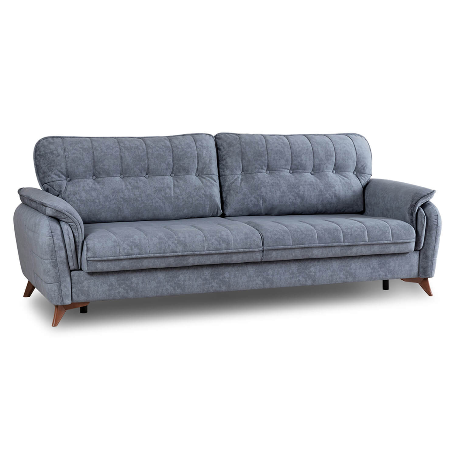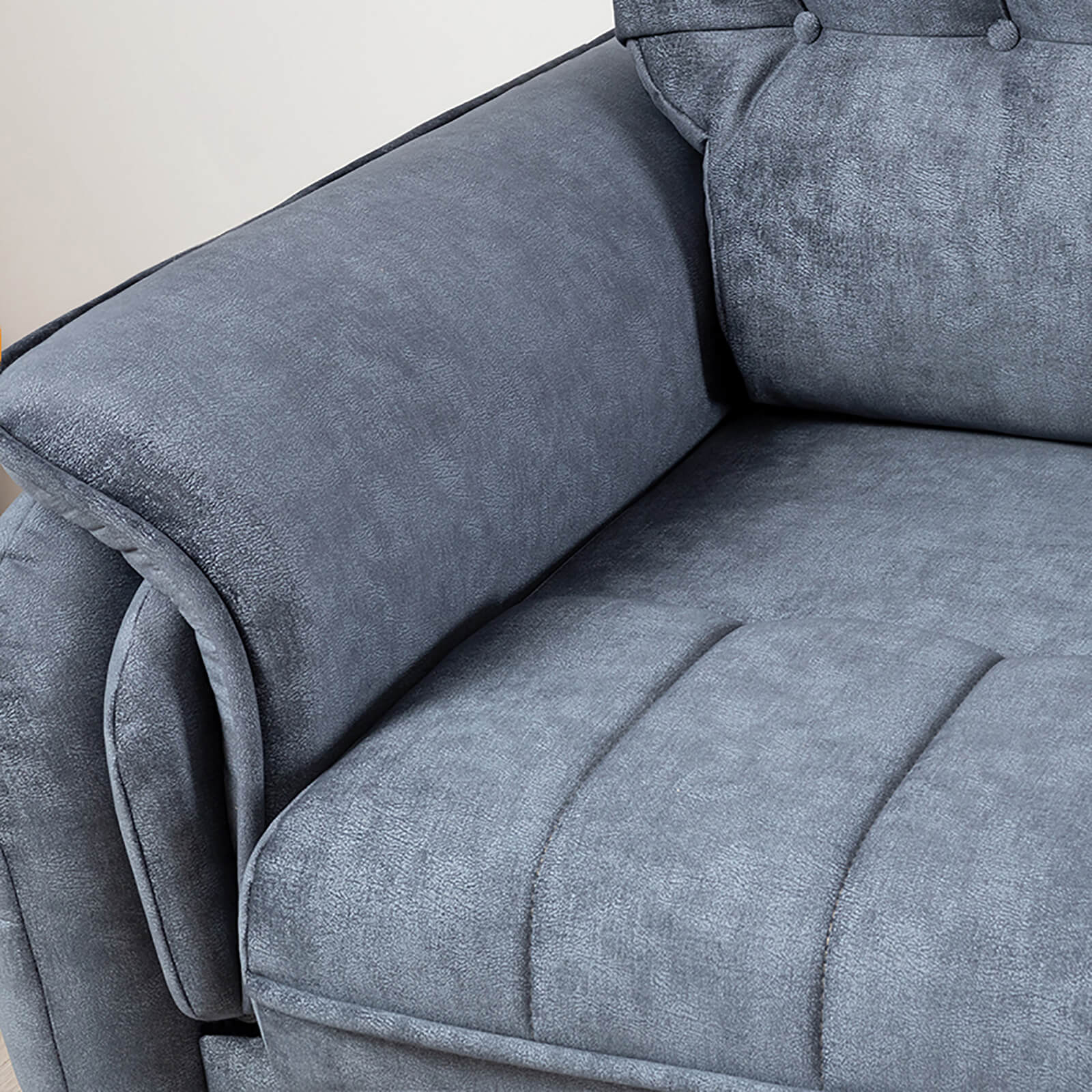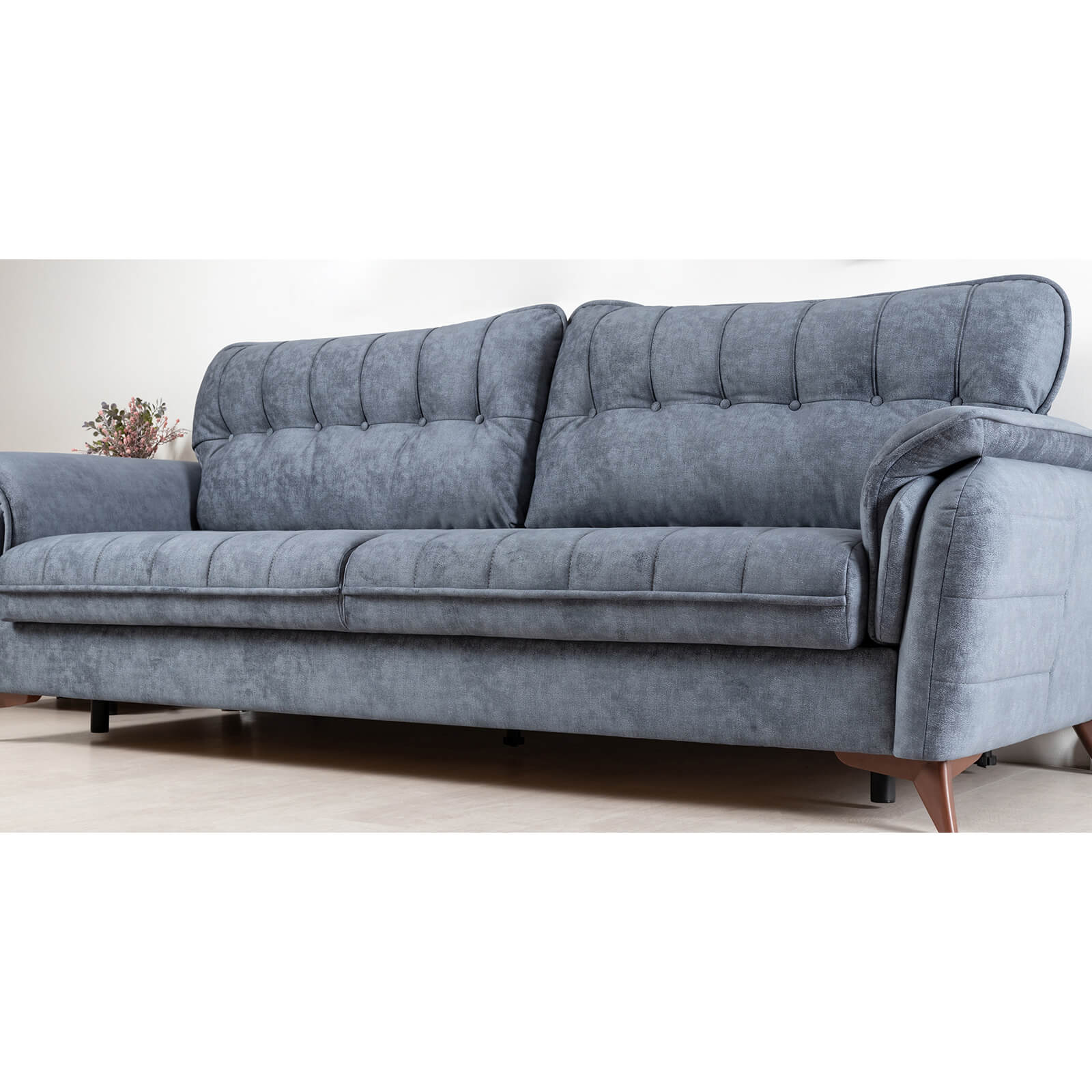 Декоративные канты на подушках дивана, подлокотниках и сиденье. Стежка на передней части сиденья и внешней части подлокотника. Защипы на верхней части подушки. Втяжки с пуговицами на приспинных подушках.