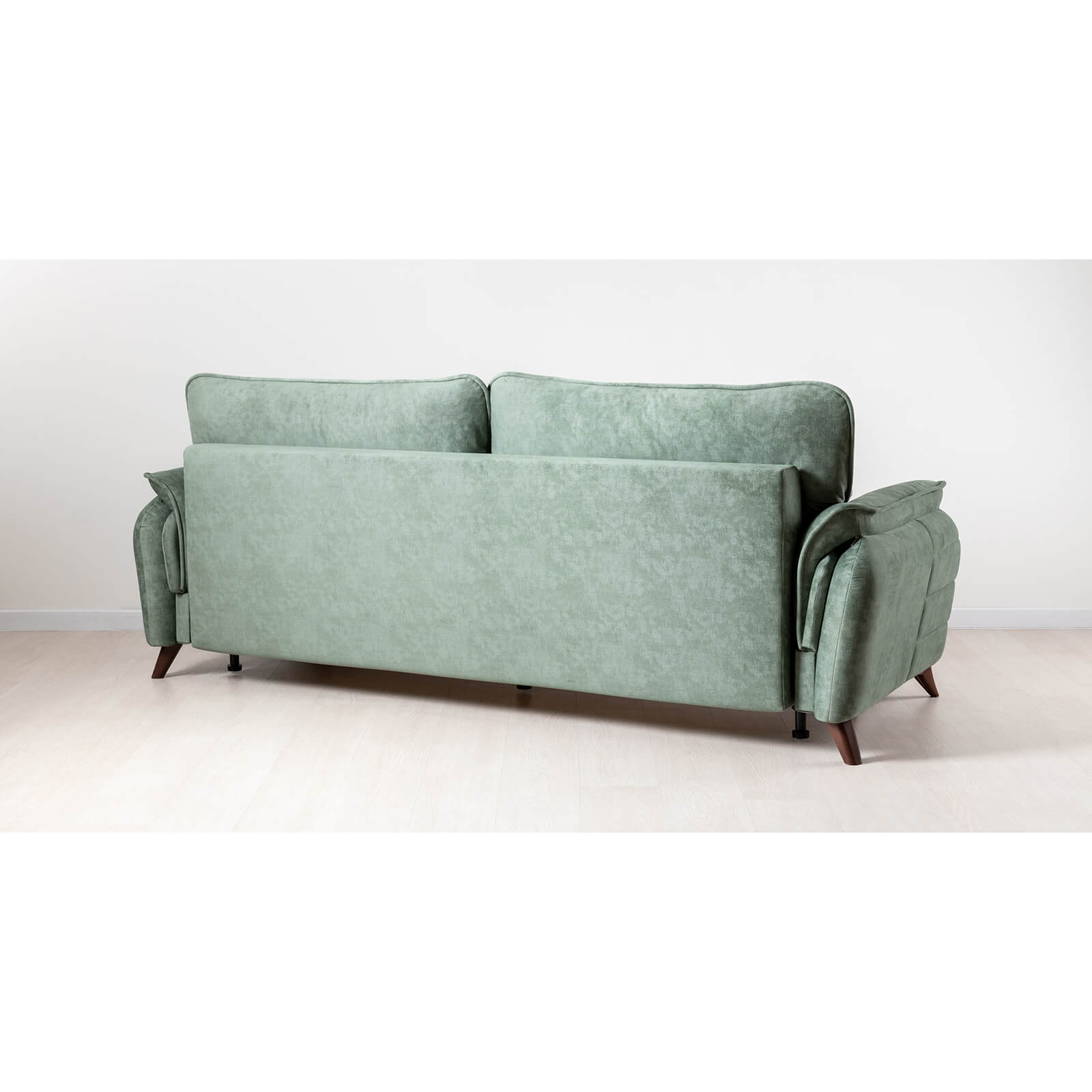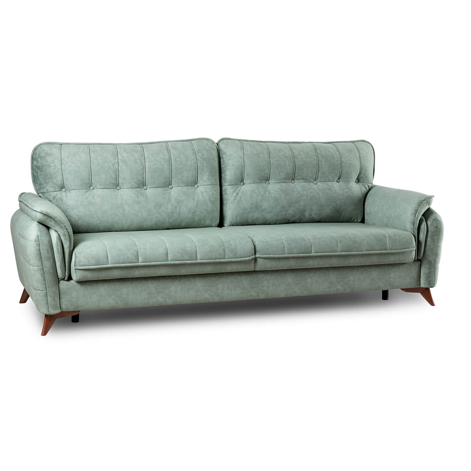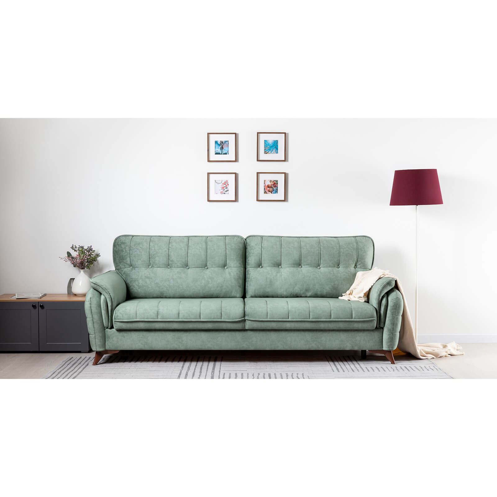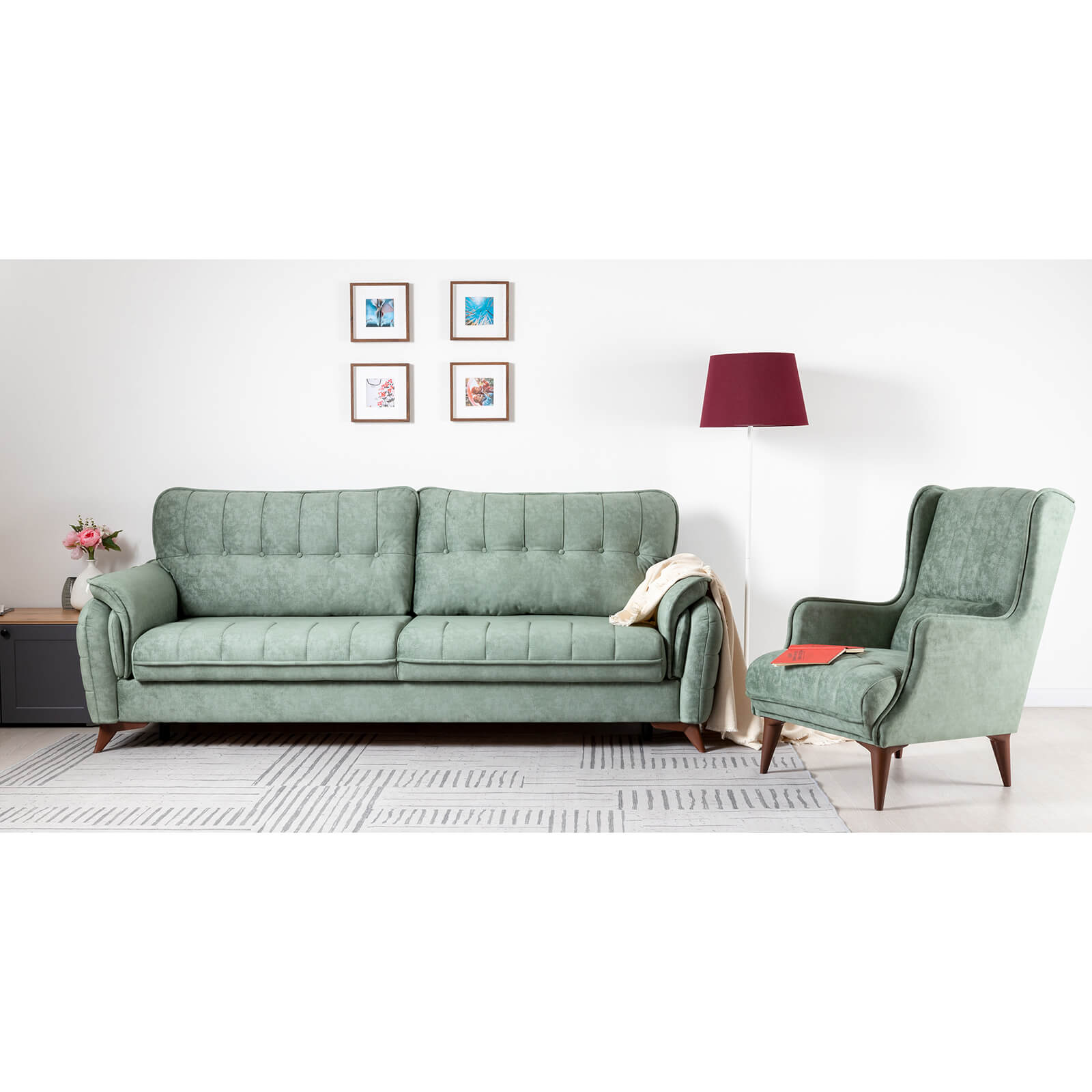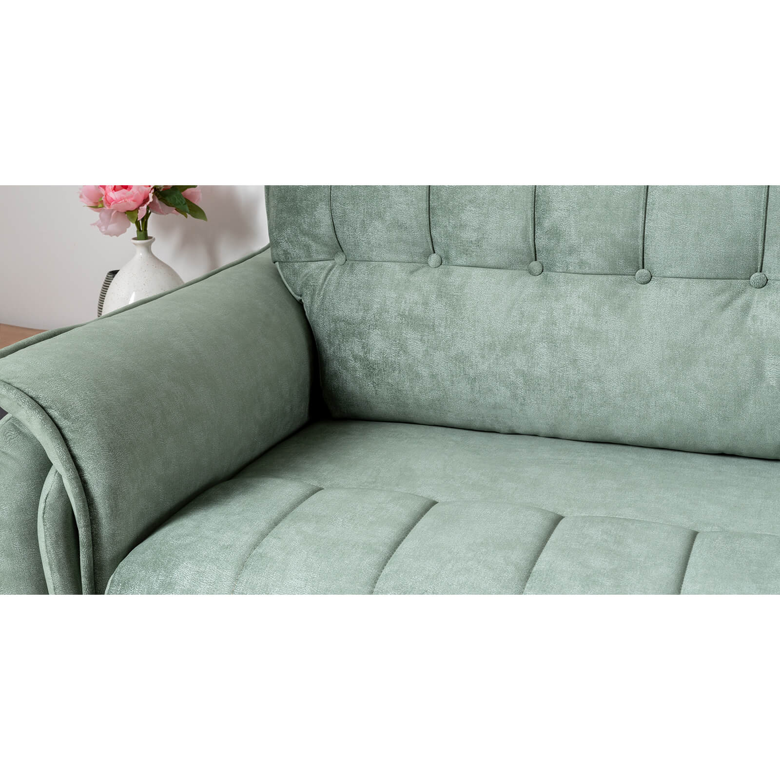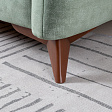Декоративные канты на подушках дивана, подлокотниках и сиденье. Стежка на передней части сиденья и внешней части подлокотника. Защипы на верхней части подушки. Втяжки с пуговицами на приспинных подушках.