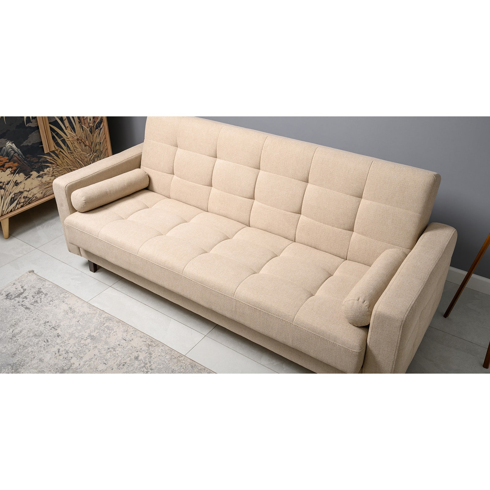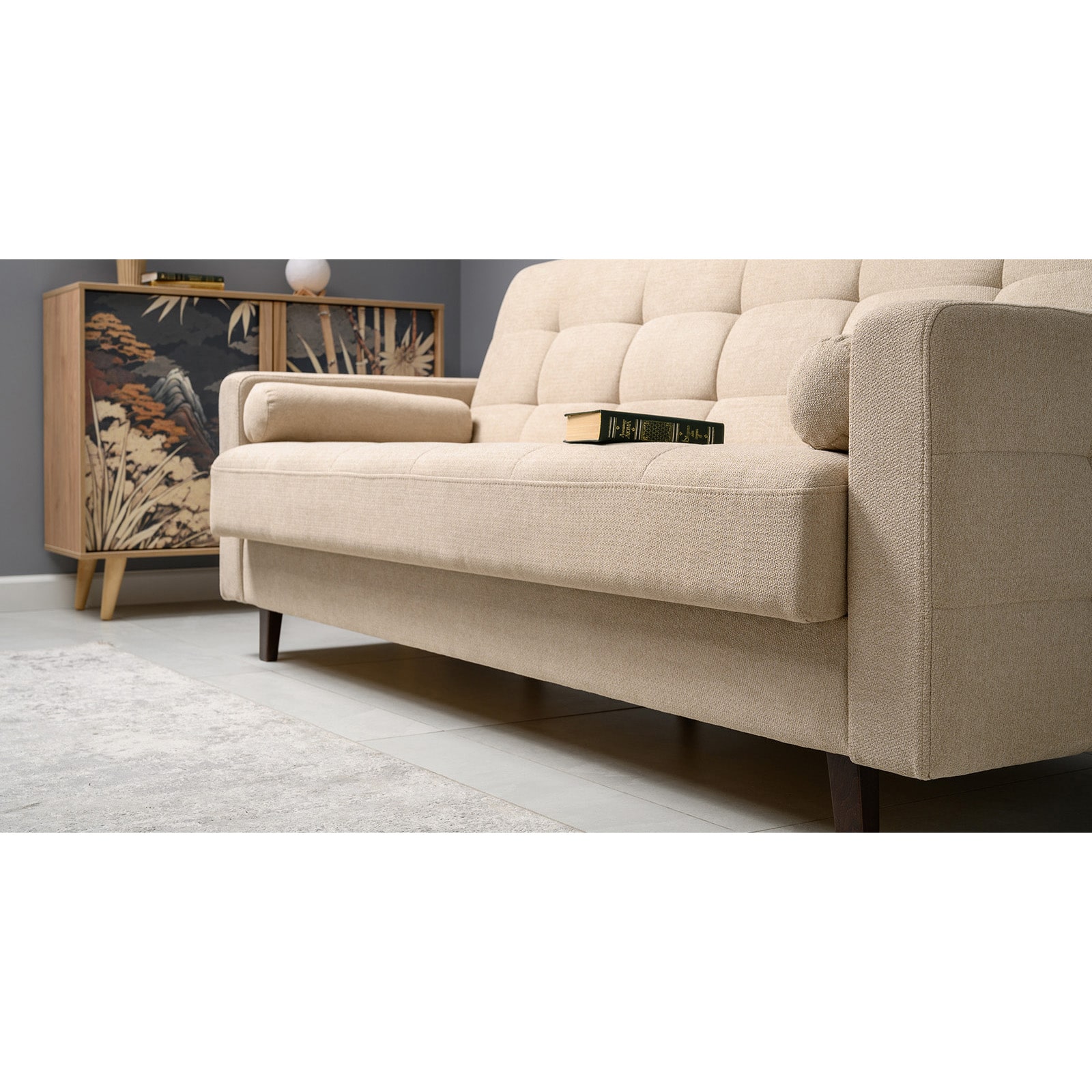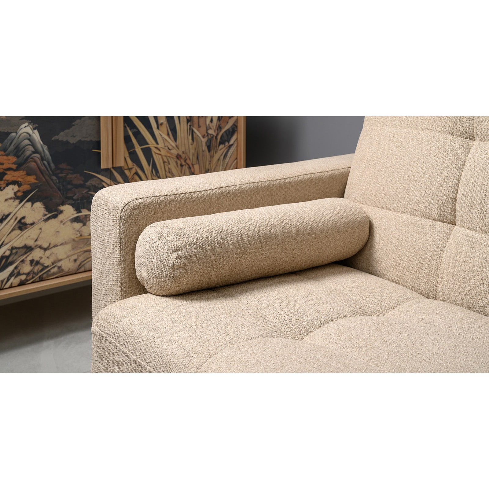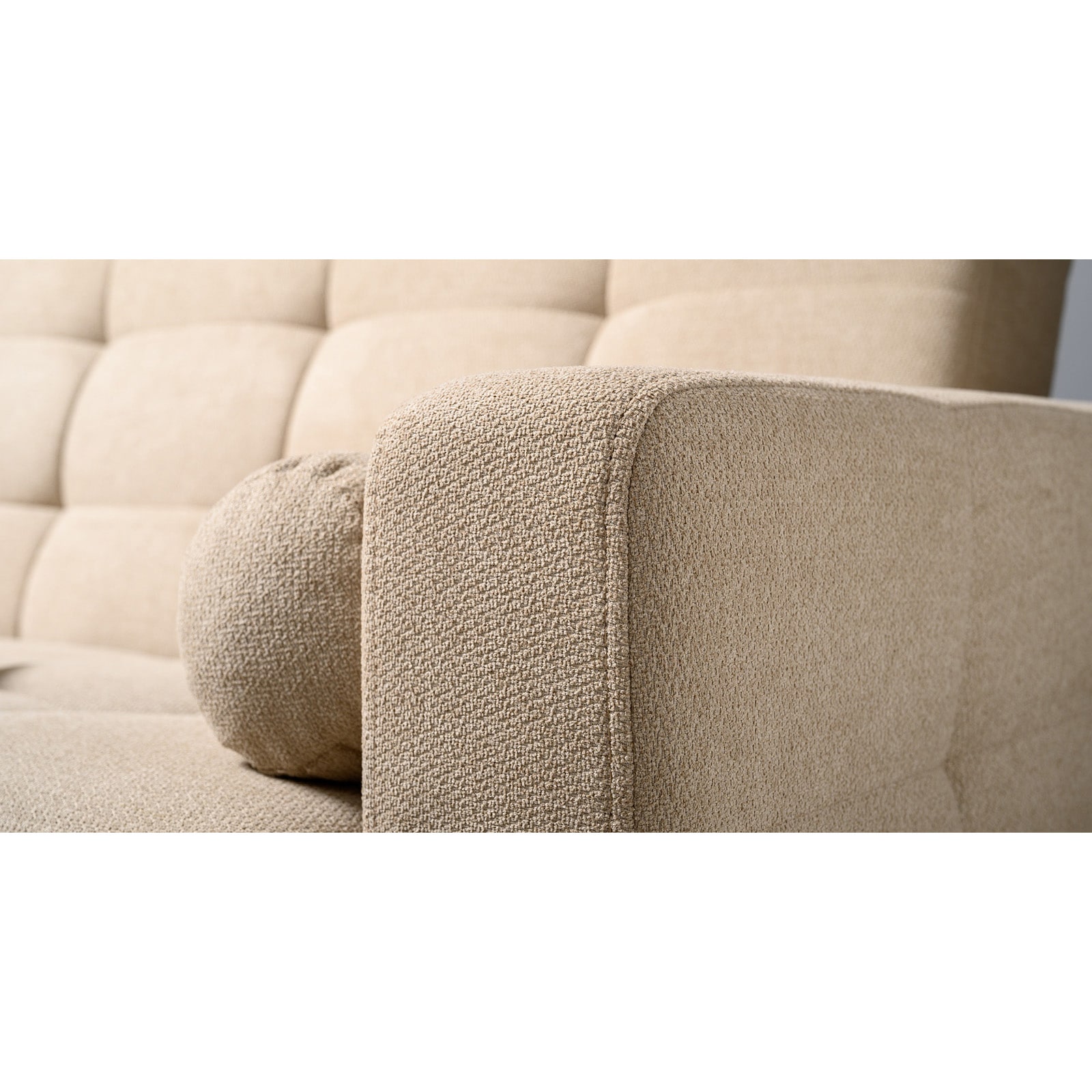 Декор: прямоугольная стежка по спинке, посадочному месту и подлокотниках, круглые подушки-валики.