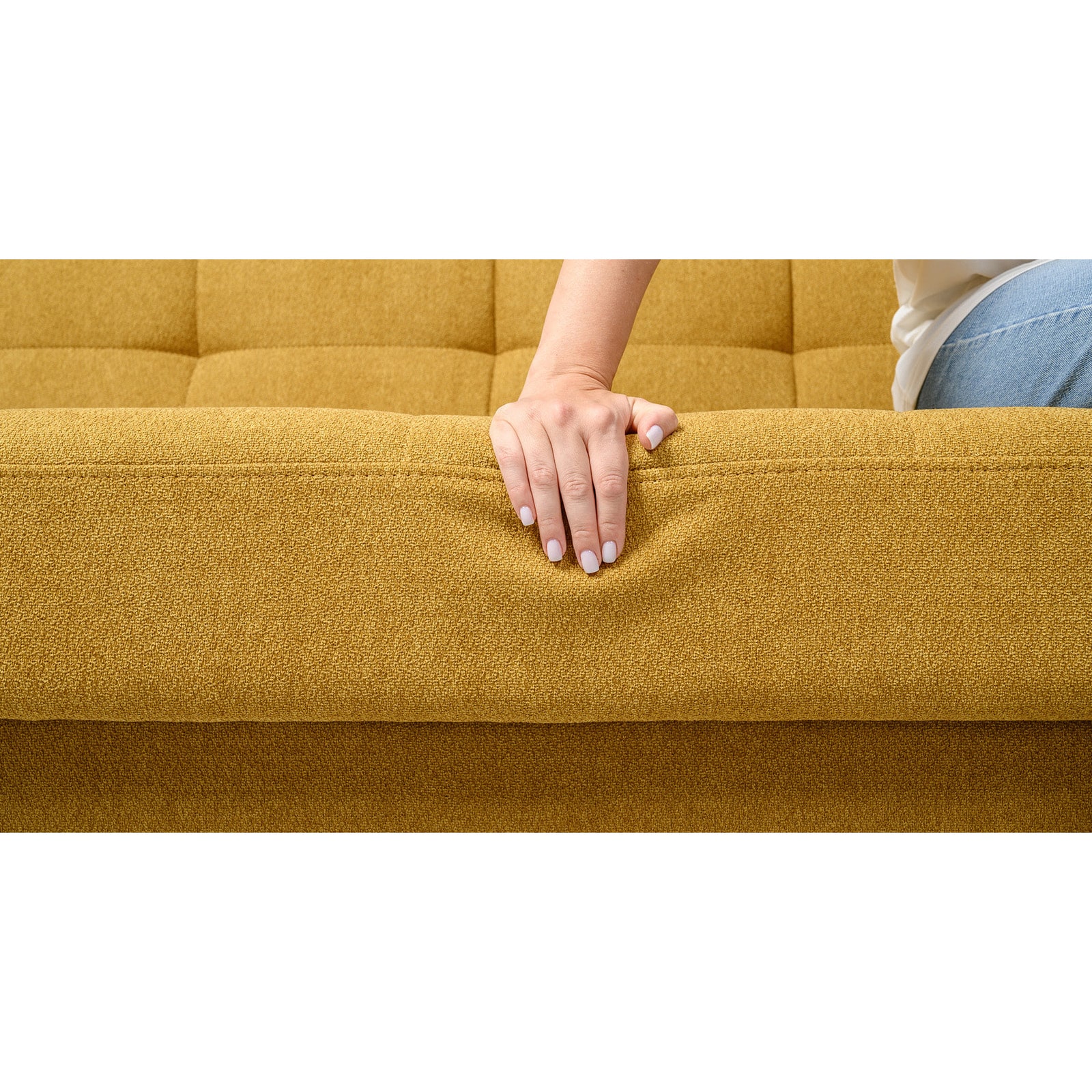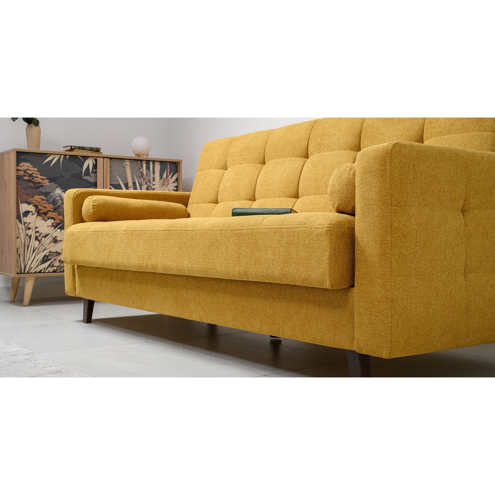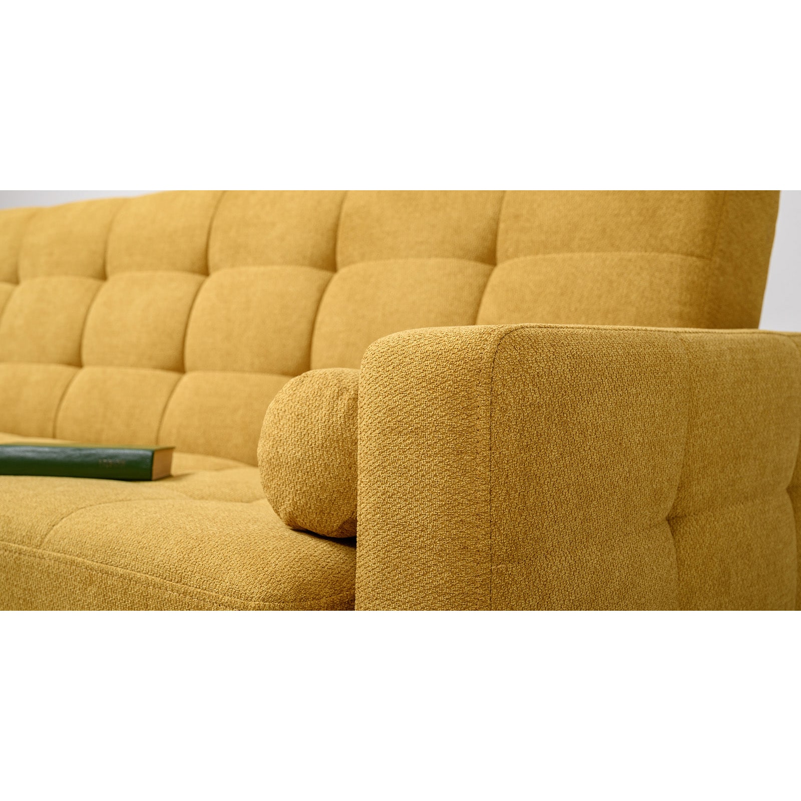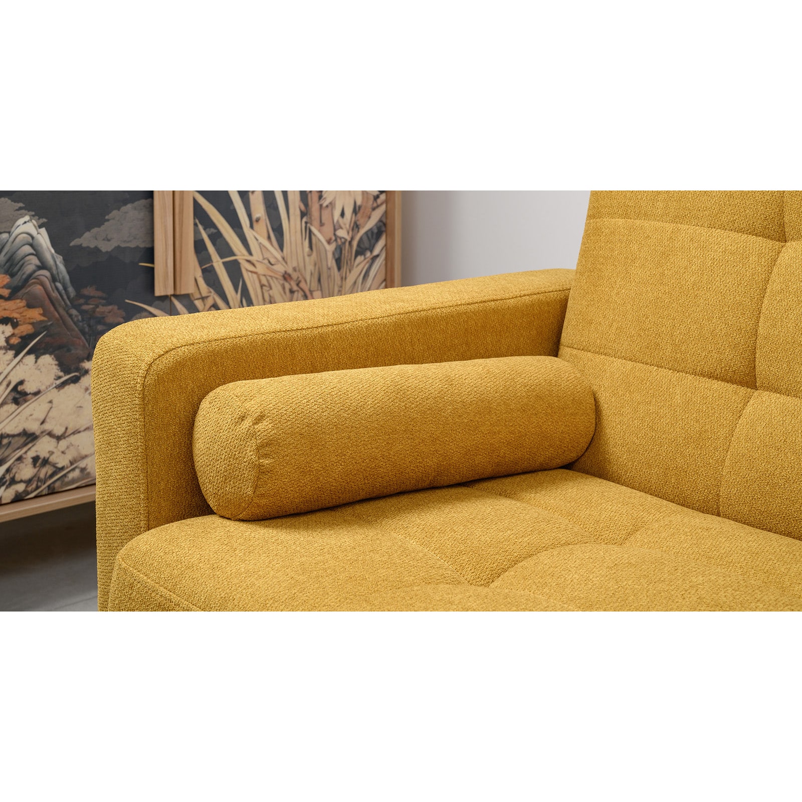 Декор: прямоугольная стежка по спинке, посадочному месту и подлокотниках, круглые подушки-валики.