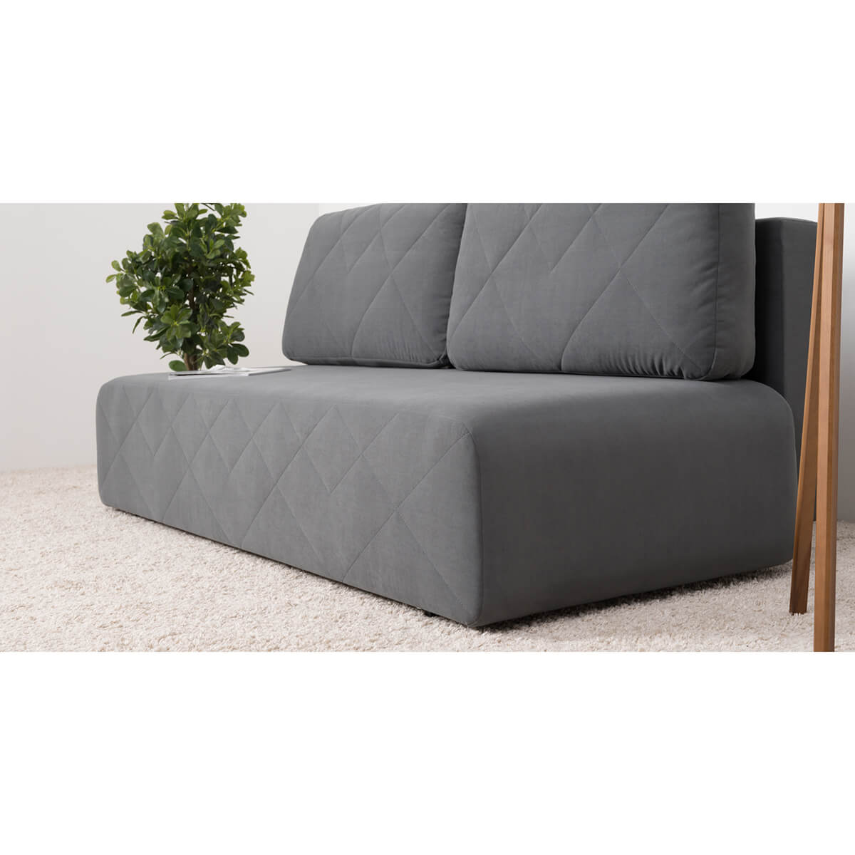 Декор: По передней части приспинных подушек и по передней части дивана проходит оригинальная стежка из диагональных строчек. Закругленные углы корпуса подчеркивают мягкие линии изделия, создают ощущение уюта и безопасности, а также отлично сочетаются с общей концепцией лаконичного дизайна.