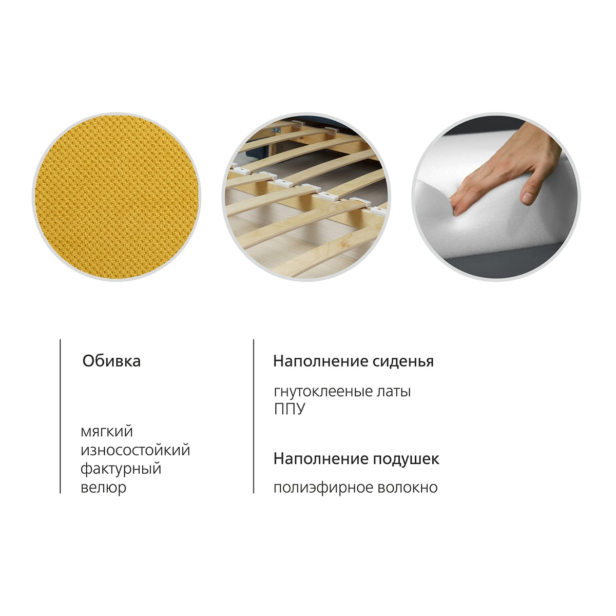 Наполнение основы – ППУ на основании из гнутоклееных лат; наполнение подушек – полиэфирное волокно «шарики».