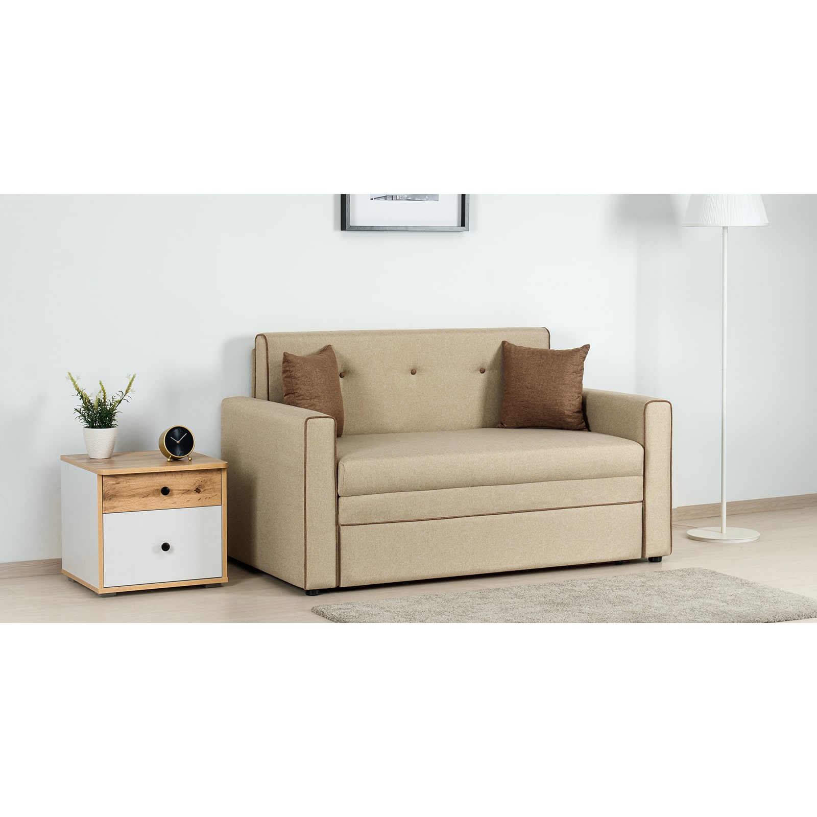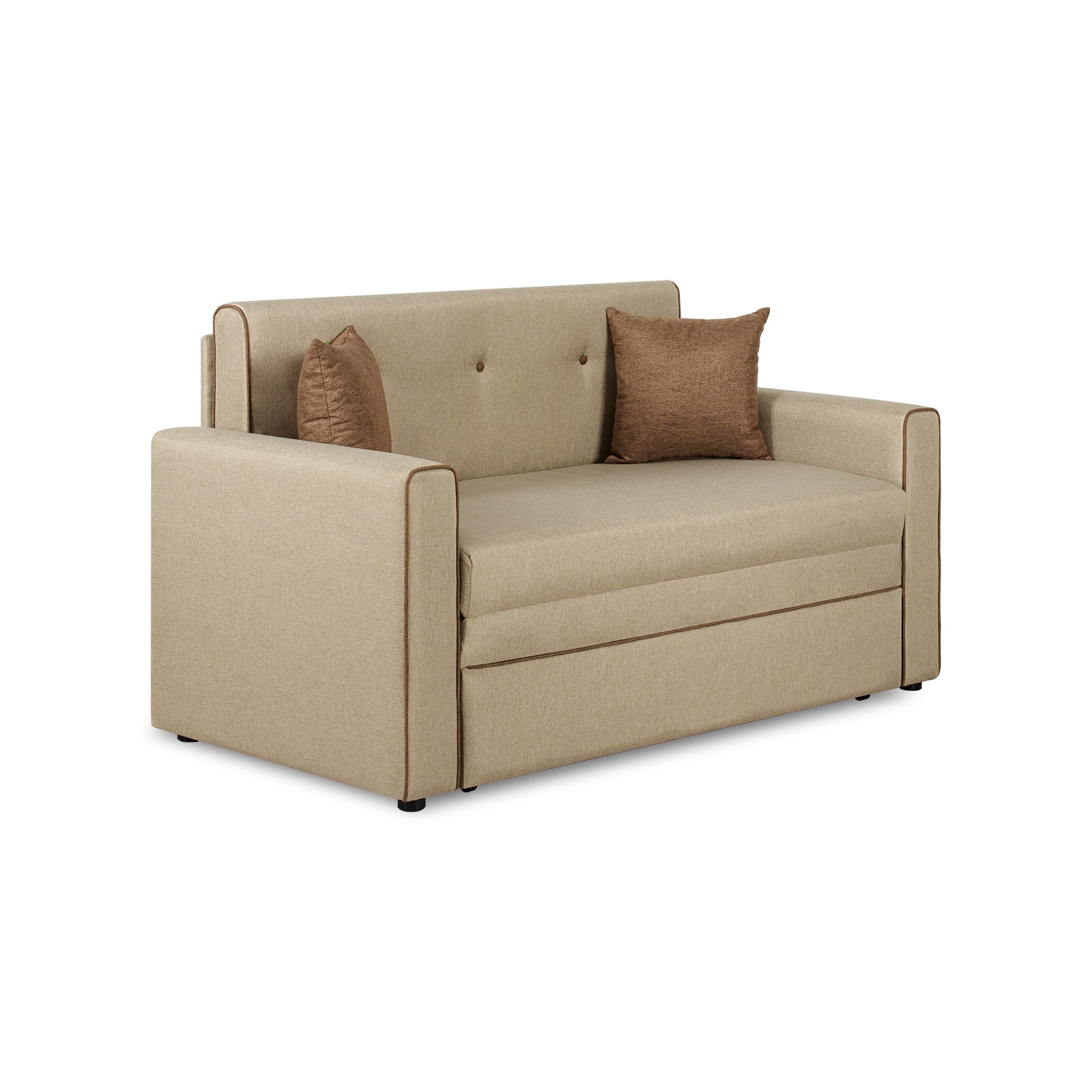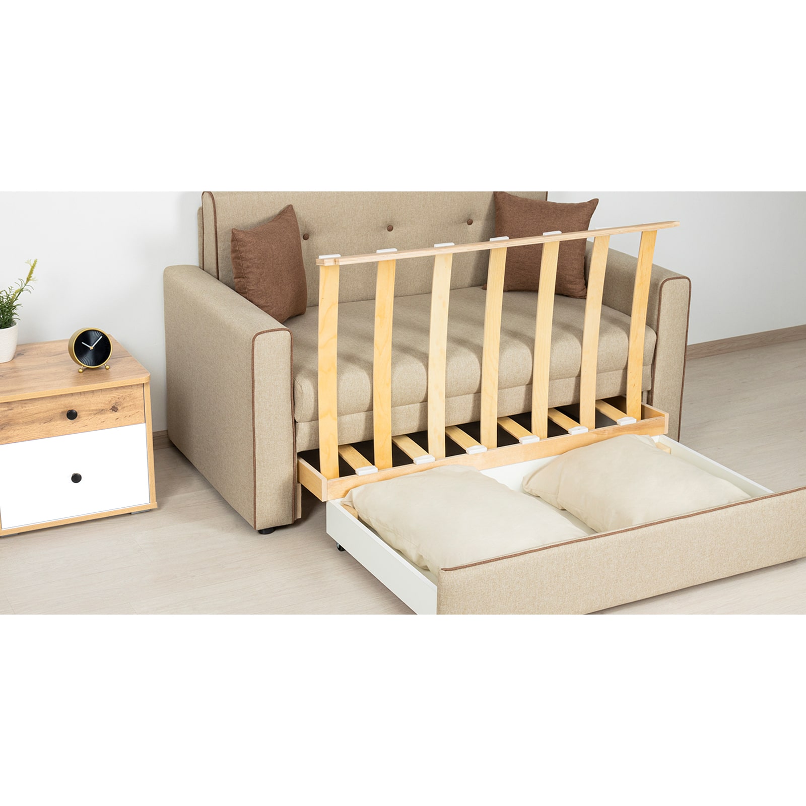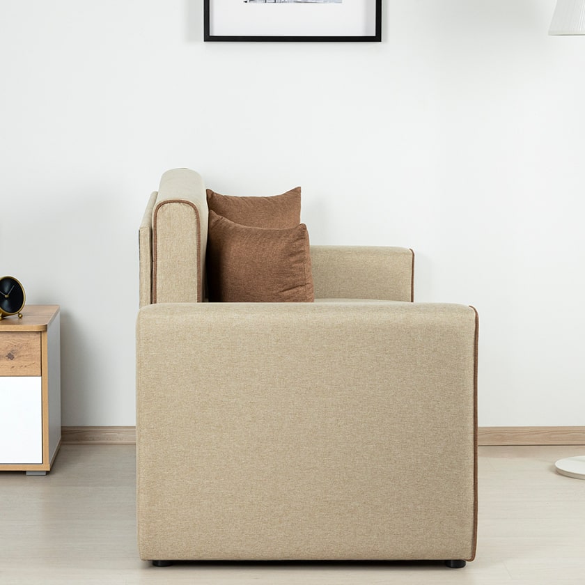 Декоративный контрастный кант по торцу спинки, торцу подлокотника, по верхнему срезу царги. Утяжки с пуговицами на спинке дивана. Две декоративные подушки в контрастной ткани.