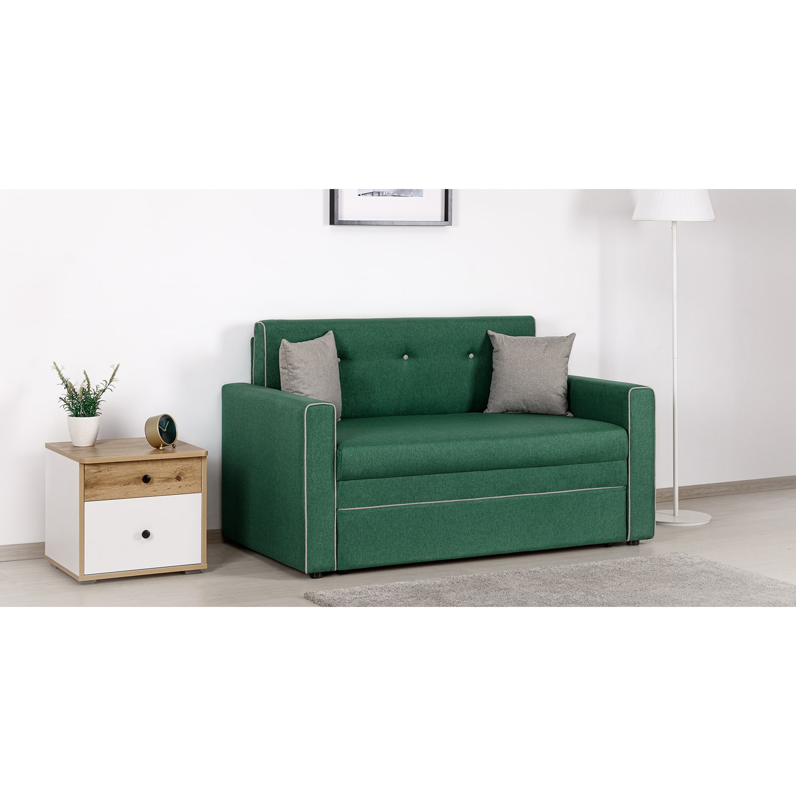 Декоративный контрастный кант по торцу спинки, торцу подлокотника, по верхнему срезу царги. Утяжки с пуговицами на спинке дивана. Две декоративные подушки в контрастной ткани.