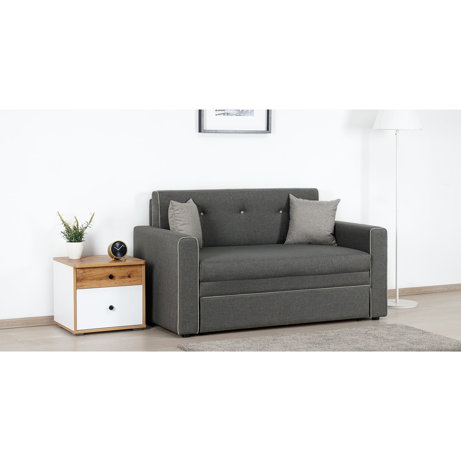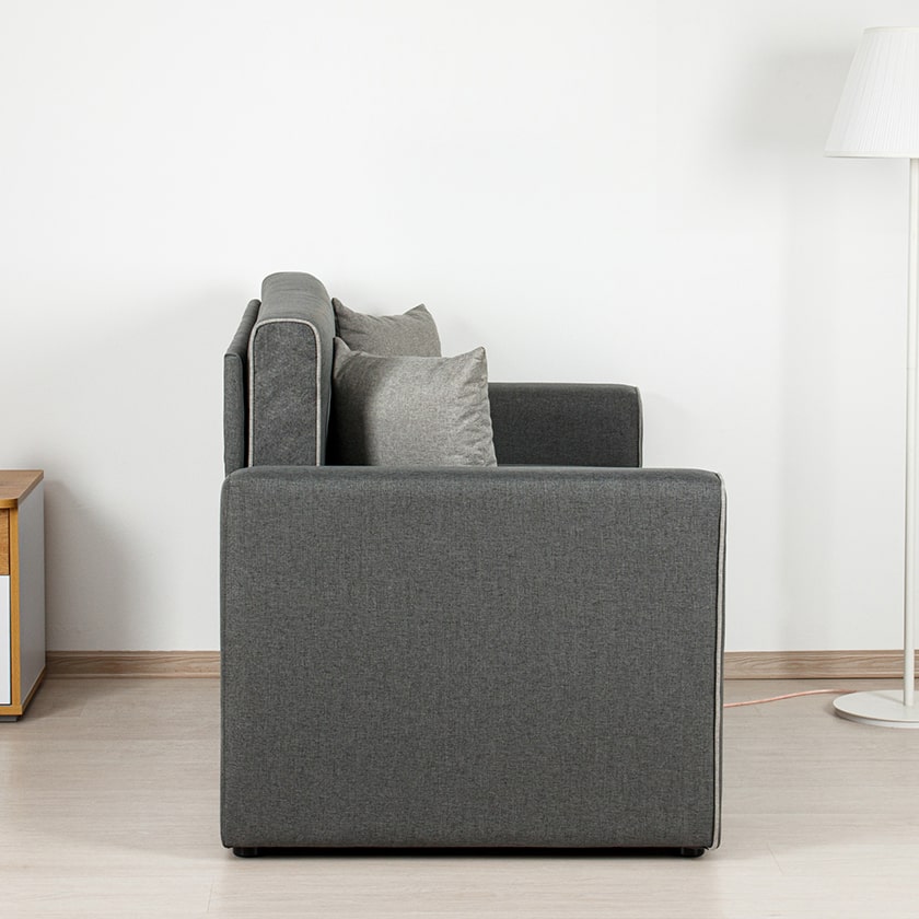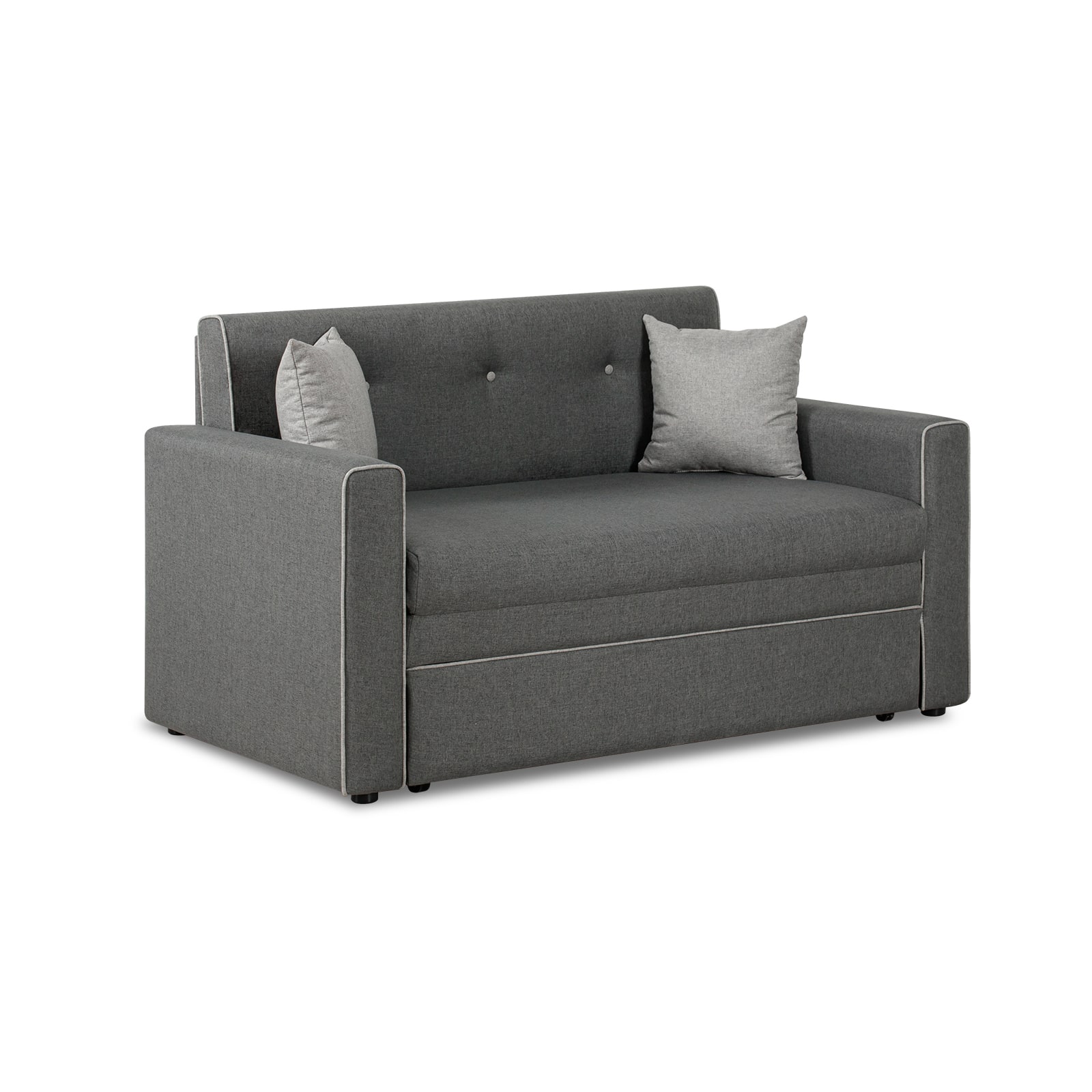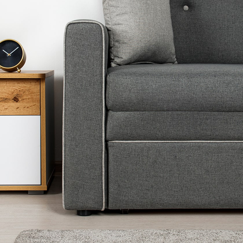 Декоративный контрастный кант по торцу спинки, торцу подлокотника, по верхнему срезу царги. Утяжки с пуговицами на спинке дивана. Две декоративные подушки в контрастной ткани.