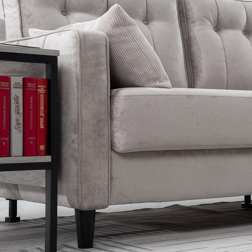 Подушки имеют трапециевидную форму, с утолщением к низу для комфорта посадки. Кант по всему периметру подушек, декоративные утяжки металлическими пуговицами, вертикальная стежка.