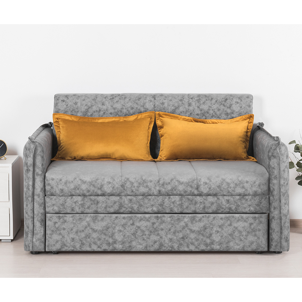 Модный компактный раскладной диванчик для гостиных или детских комнат. На подлокотниках и подушке цельнокроеные канты. На сиденье и спинке 3 вертикальные отделочные строчки на стёжке.