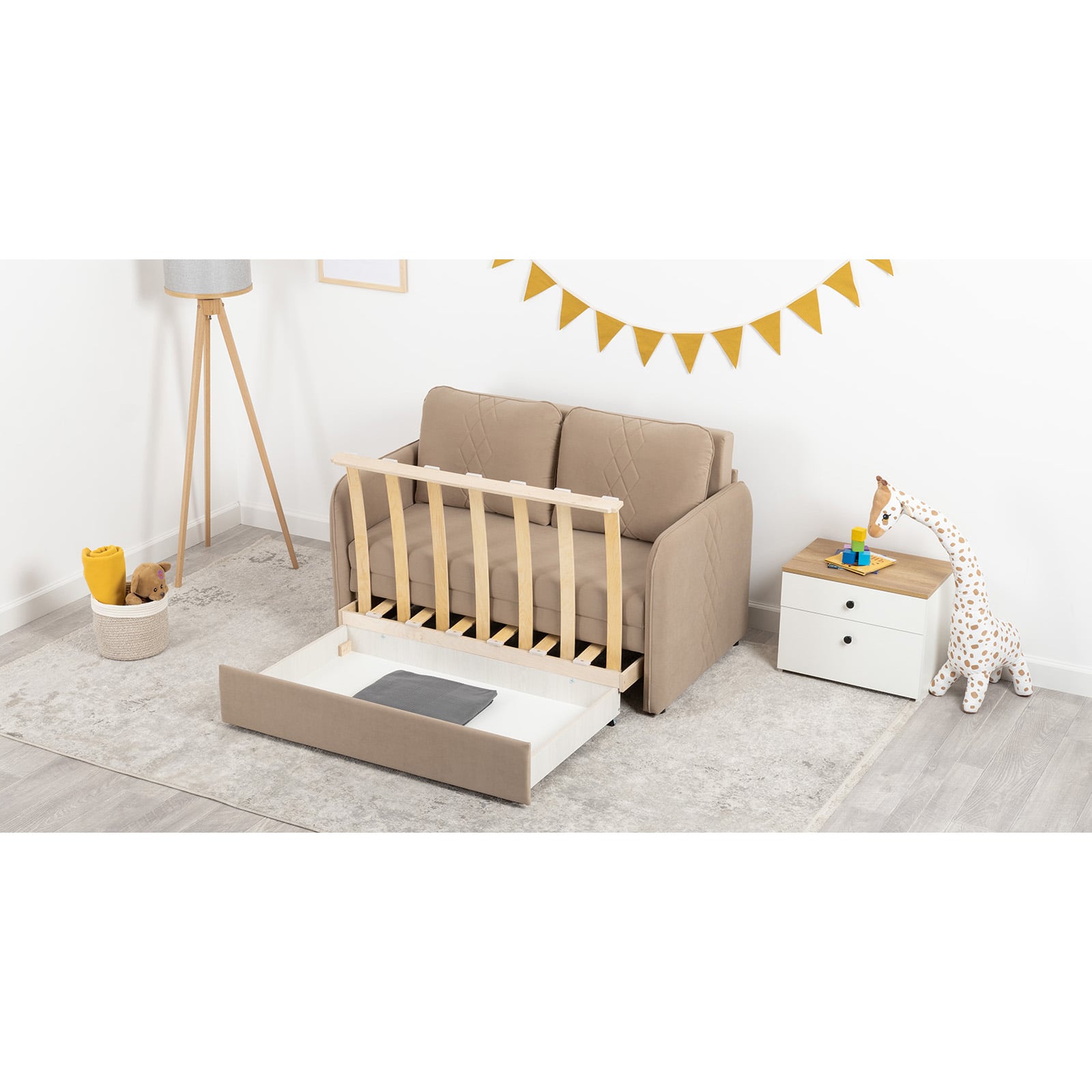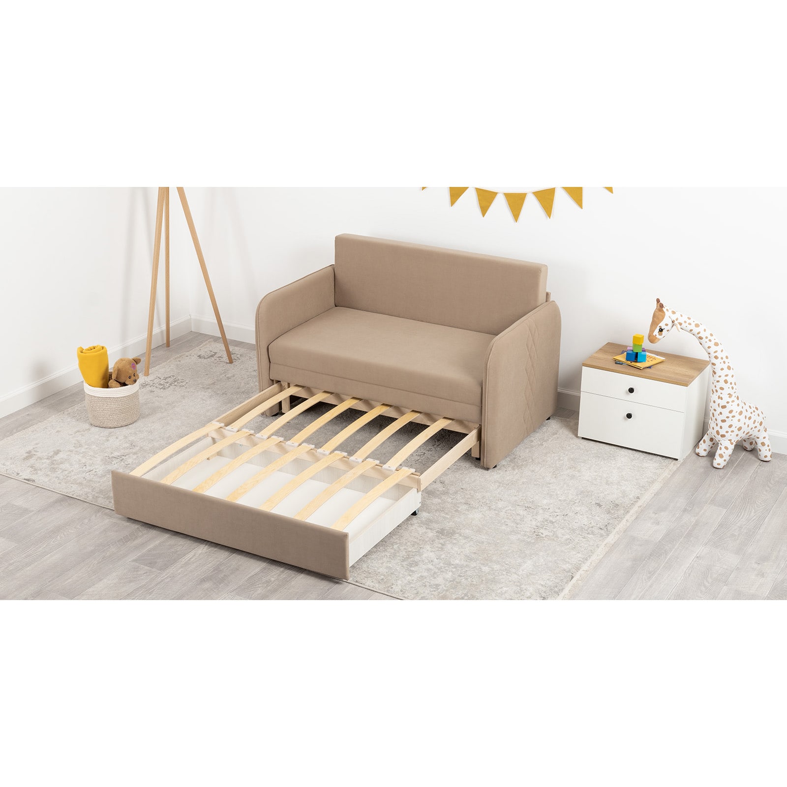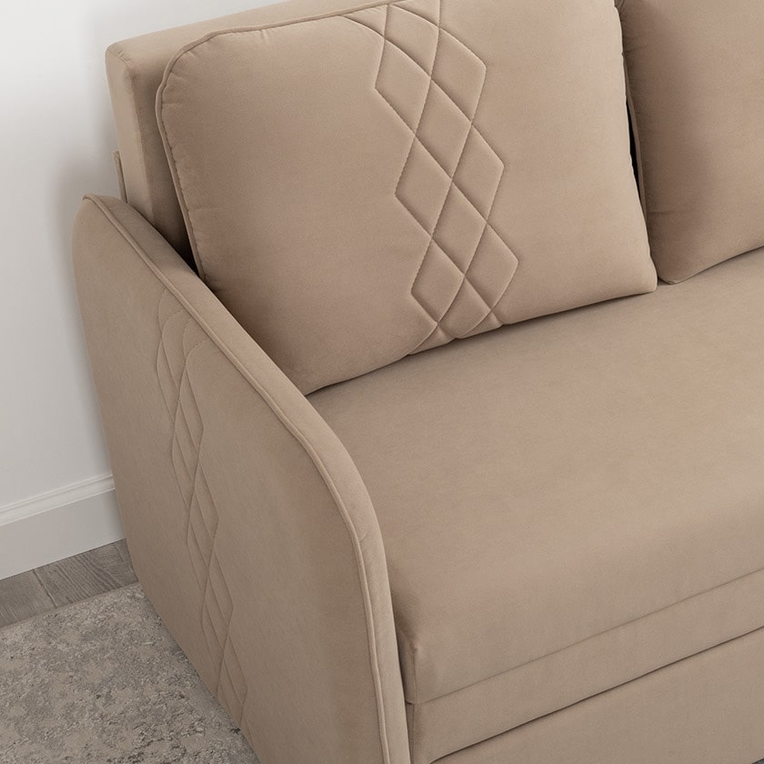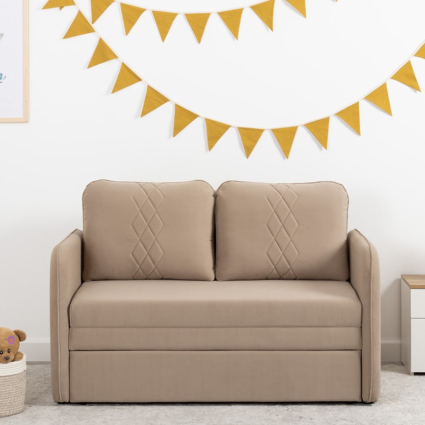 Стильный компактный диван для детской и гостиной. При своих скромных размерах он трансформируется в полноценное спальное место для детей и подростков. Лаконичный дизайн в виде декоративной отстрочки подчеркивает фактуру велюра, а небольшие размеры позволят разместить его в любом пространстве.