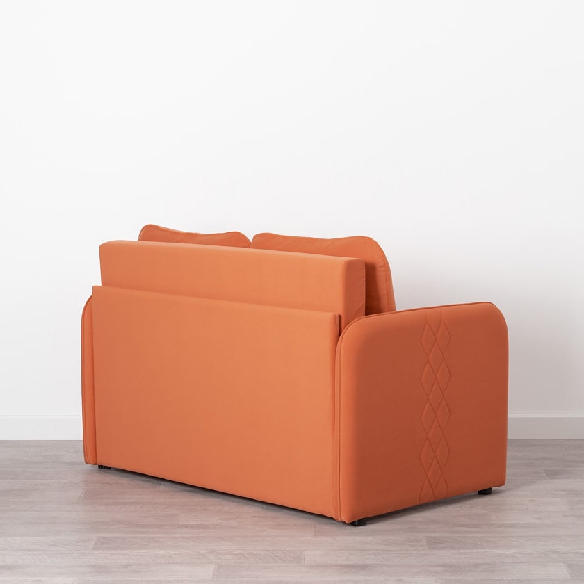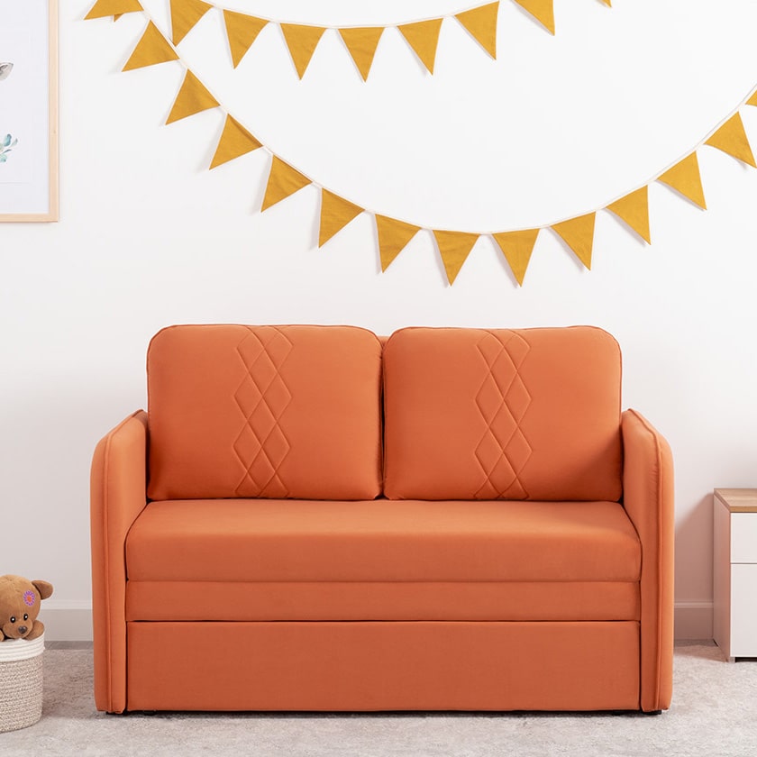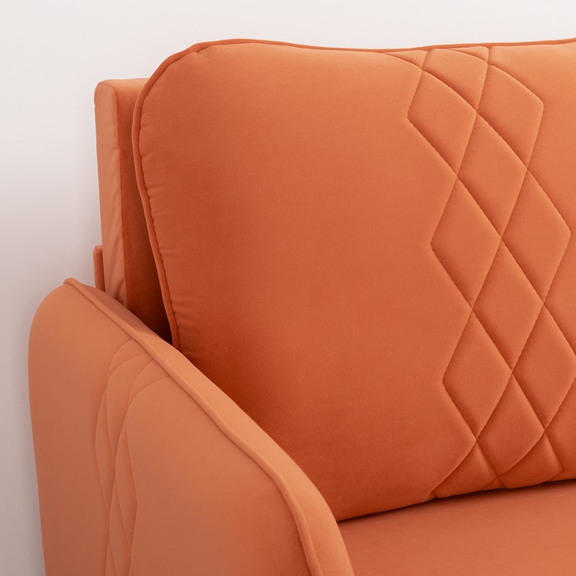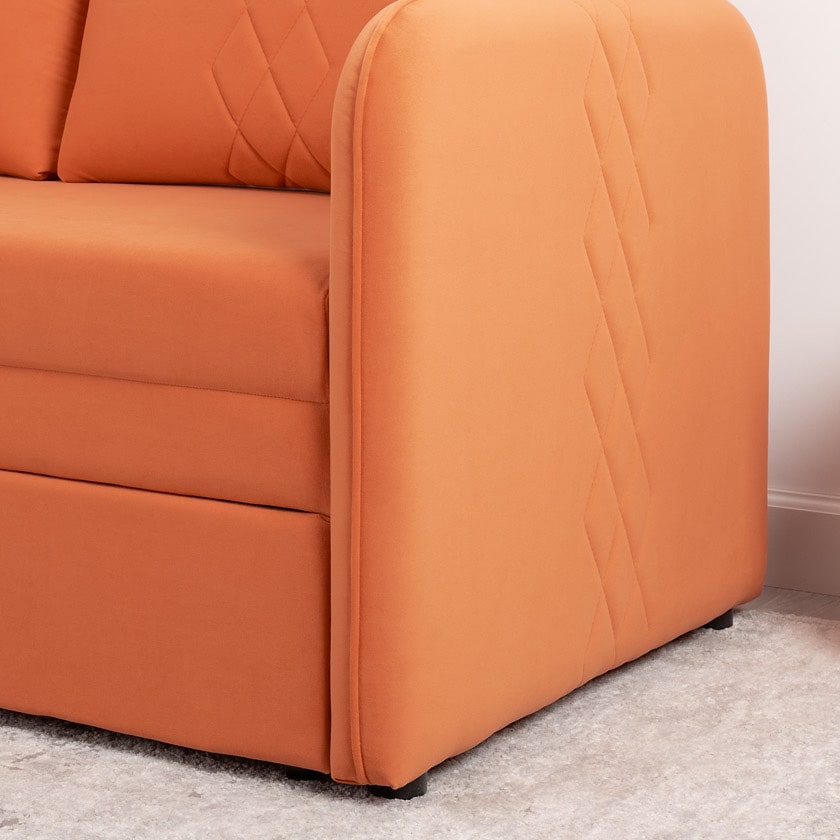 Стильный компактный диван для детской и гостиной. При своих скромных размерах он трансформируется в полноценное спальное место для детей и подростков. Лаконичный дизайн в виде декоративной отстрочки подчеркивает фактуру велюра, а небольшие размеры позволят разместить его в любом пространстве.
