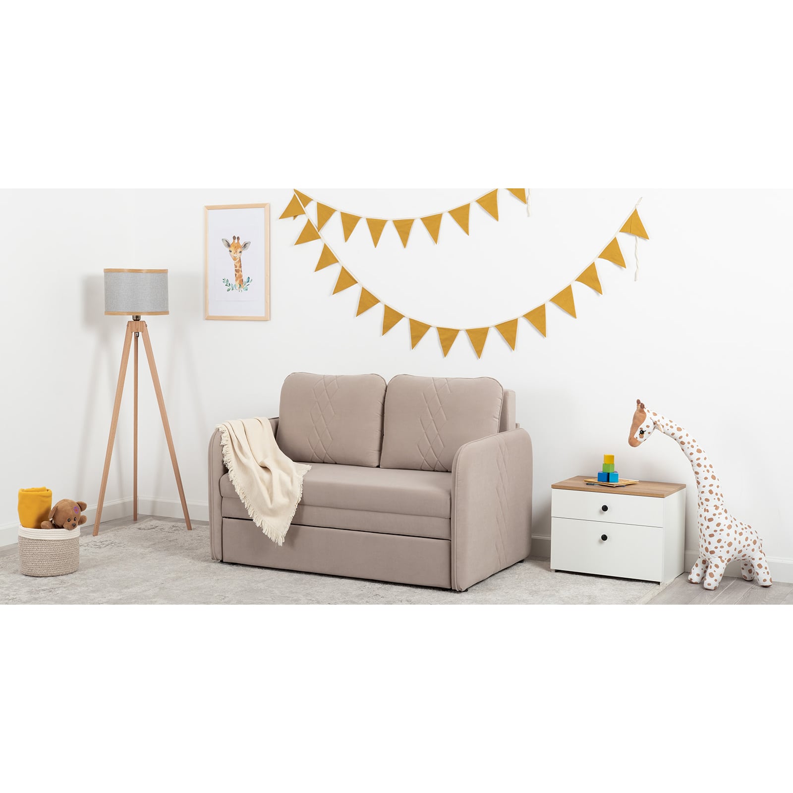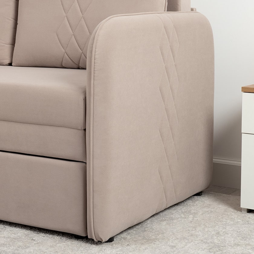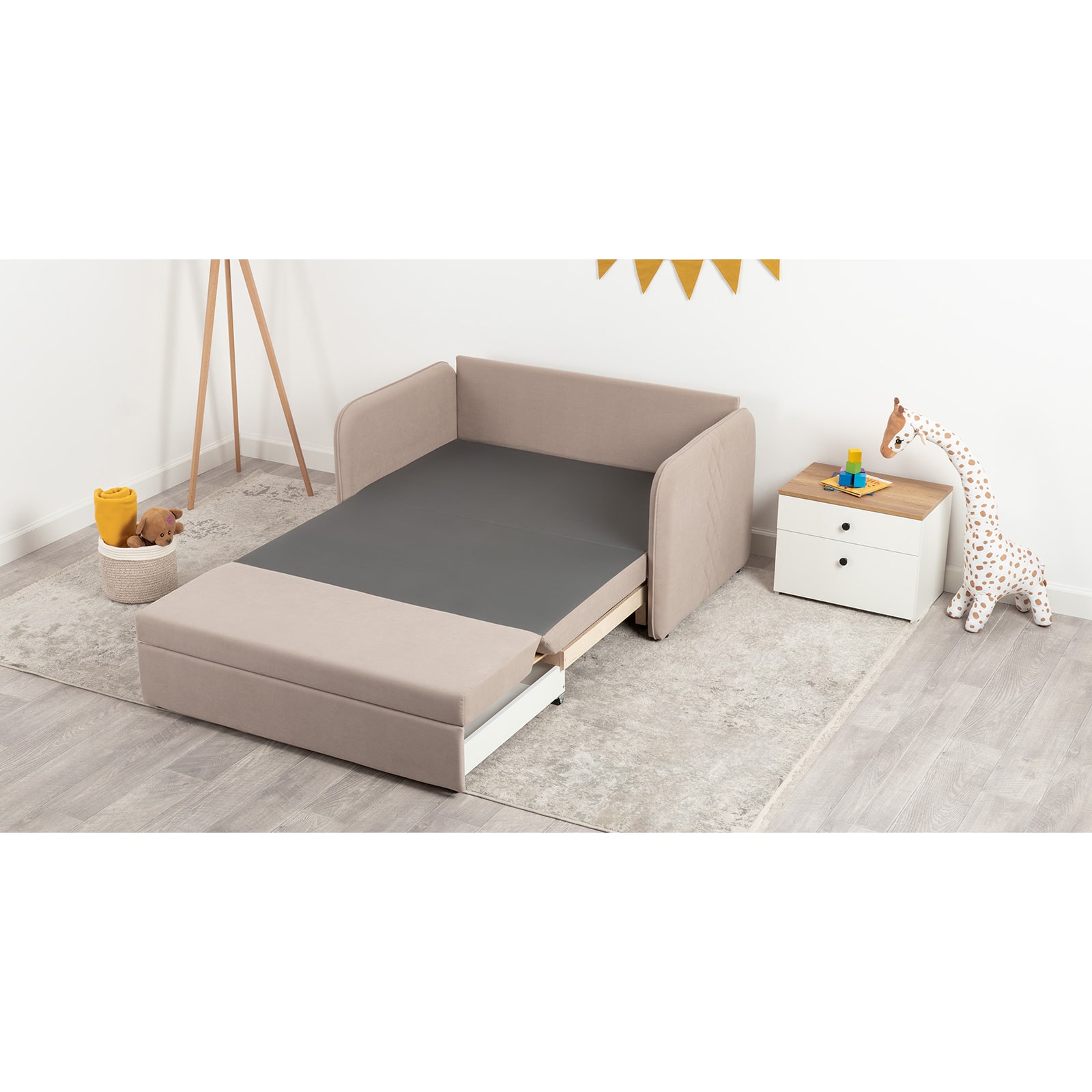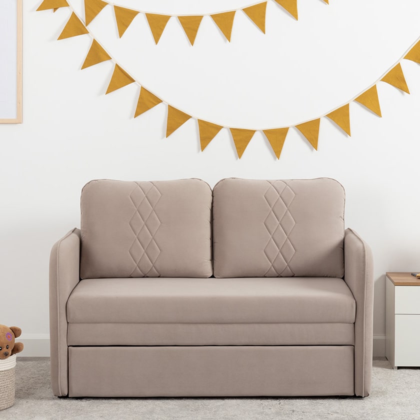 Стильный компактный диван для детской и гостиной. При своих скромных размерах он трансформируется в полноценное спальное место для детей и подростков. Лаконичный дизайн в виде декоративной отстрочки подчеркивает фактуру велюра, а небольшие размеры позволят разместить его в любом пространстве.