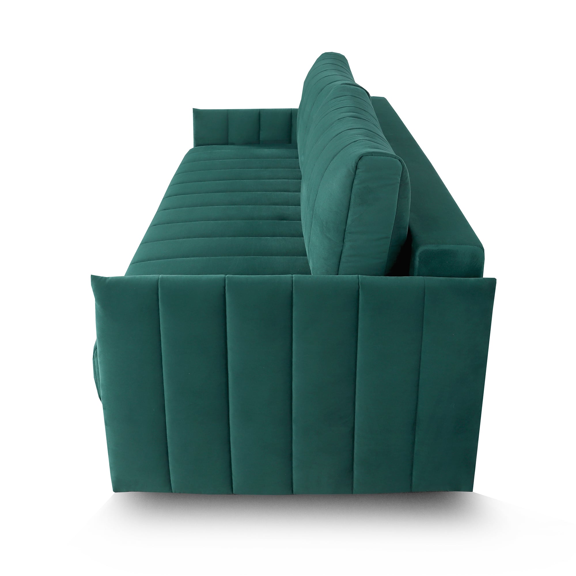 Подушки, сиденье и подлокотники дивана оформлены модной вертикальной стёжкой в современном стиле.