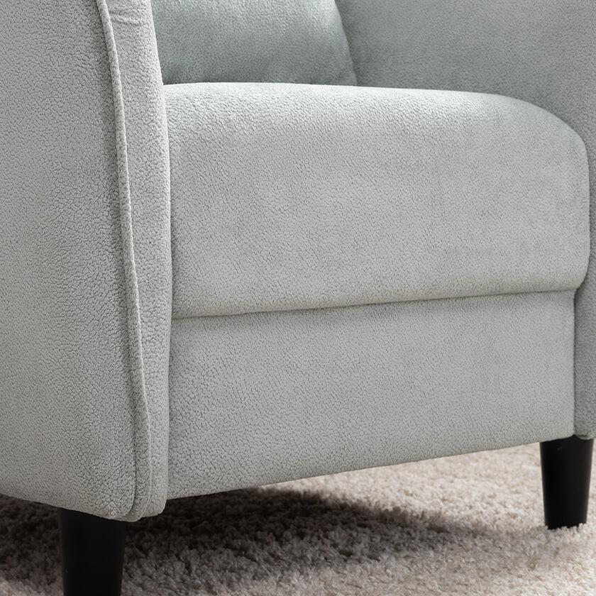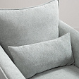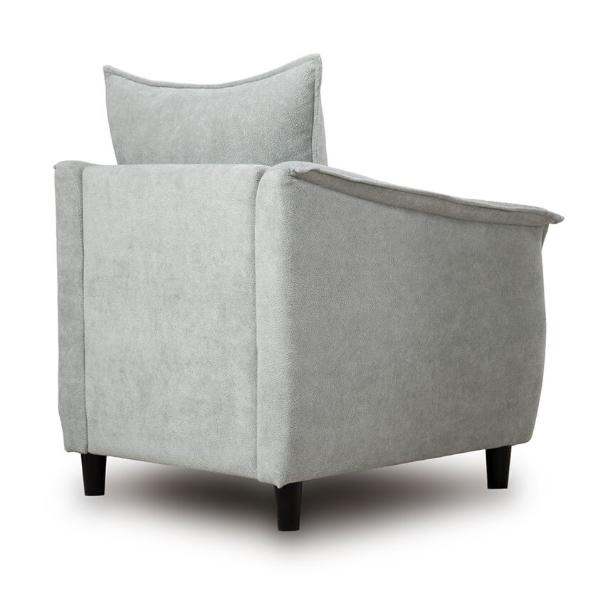 Кресло с приспинной подушкой трапецивидной формы на молнии, по трем сторонам которой проложена отделочная строчка на 1,2 см. По контуру боковин проложен декоративный кант на 1,2 см основной ткани. Кант проходит по центру передней части боковины, а по внутренней верхней части сборка.
