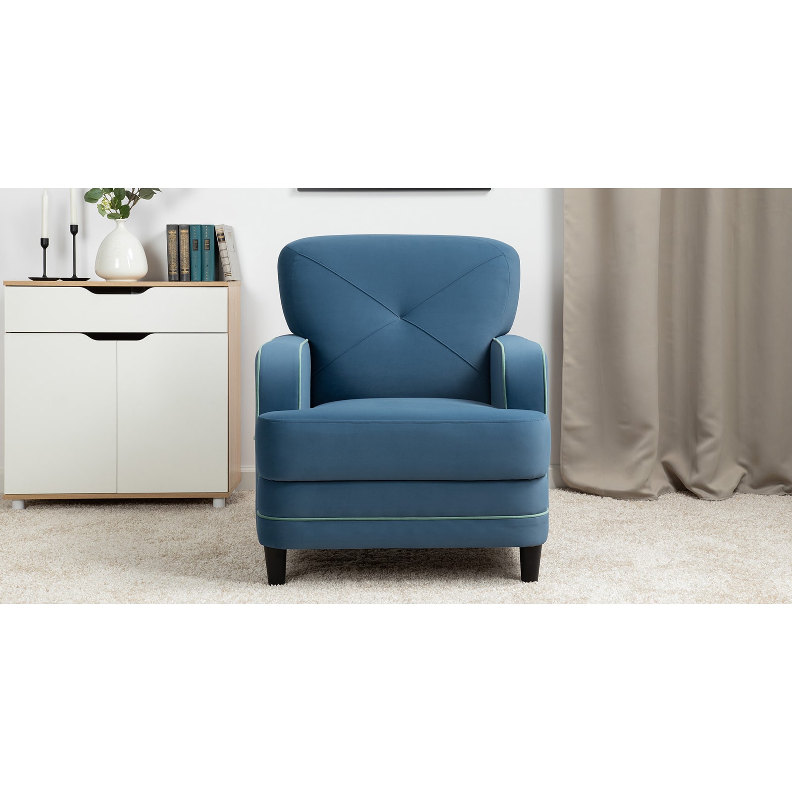 Декоративные канты на вставке подлокотников. Пуговицы в местах пересечения кантов на подушке и вставке подлокотников. По торцам подлокотников и думках контрастный декоративный кант. Защипы на сиденье и подушке.