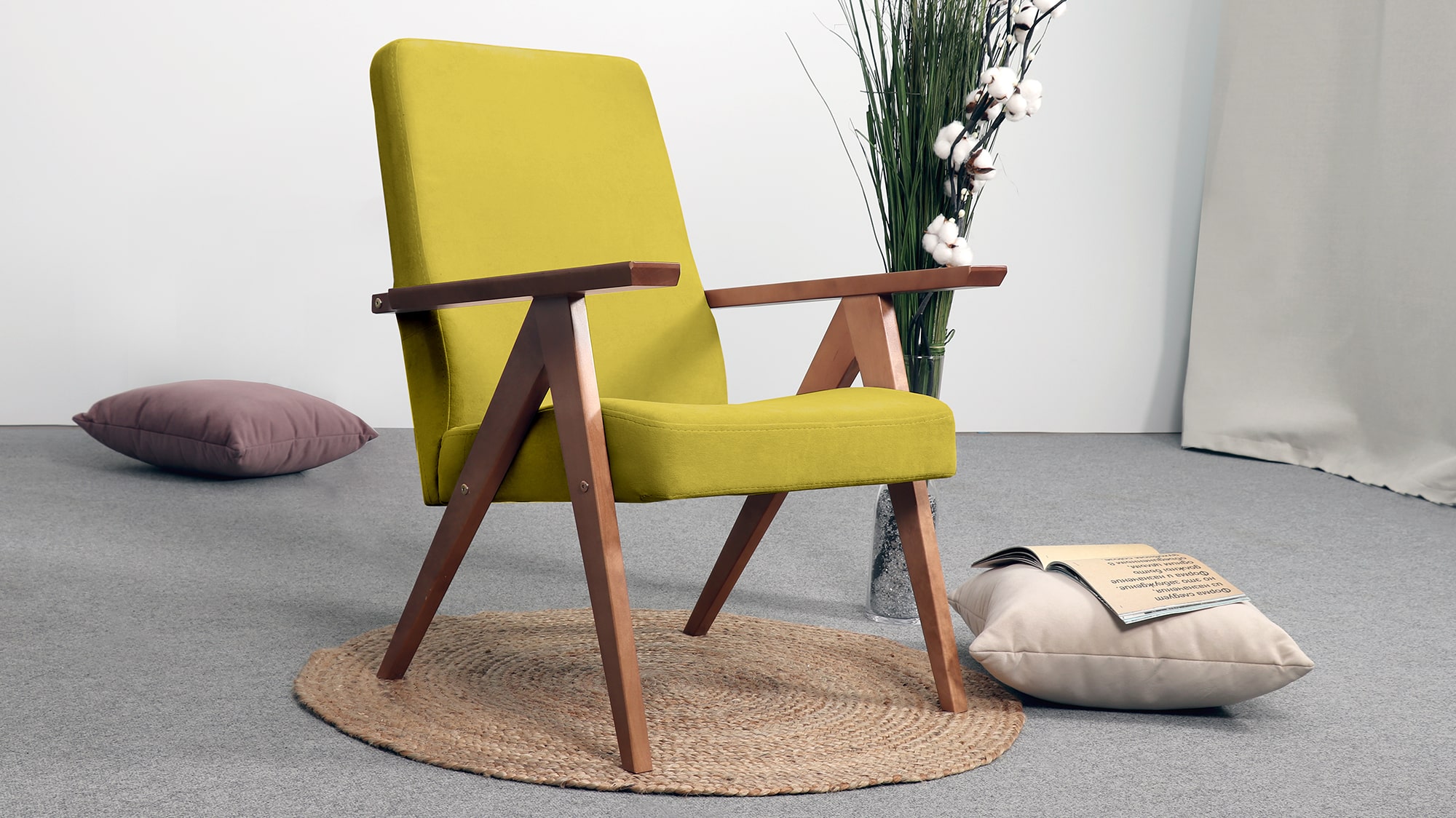 Кресло имеет простой и элегантный силуэт. Оно выполнено в уникальном ретро дизайне и доступно в нескольких цветовых вариантах, что позволяет выбрать наиболее подходящее для вашего дома.