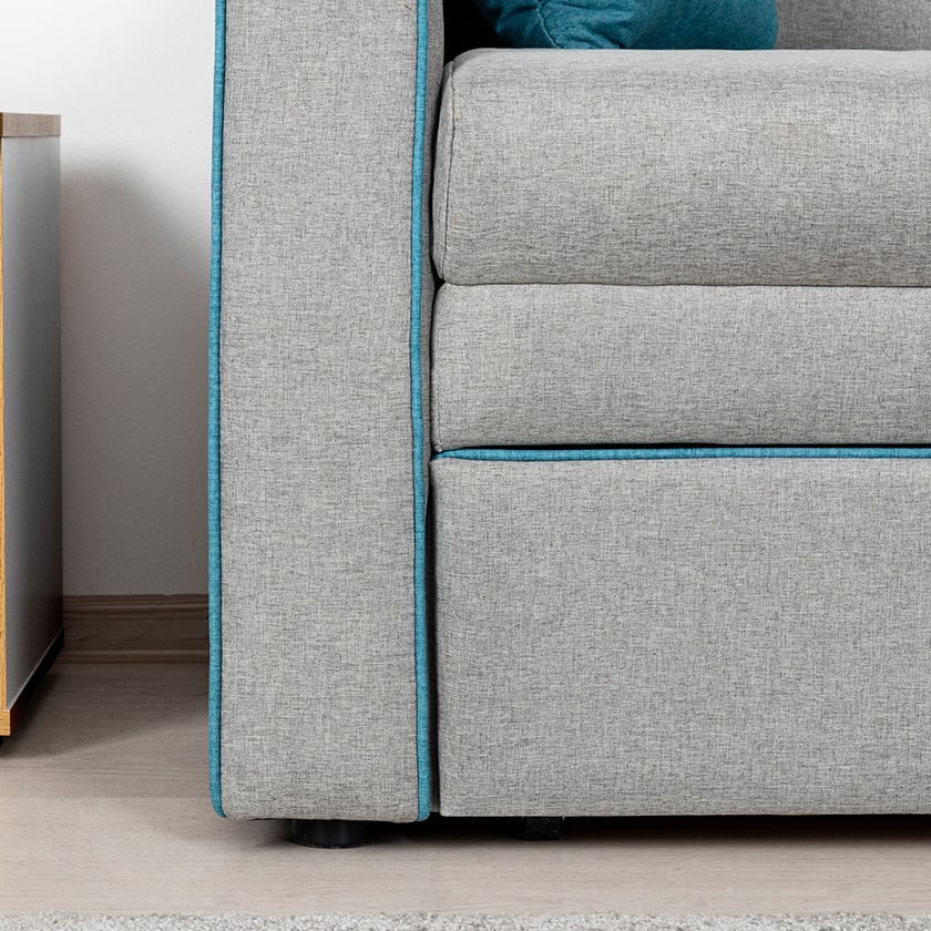 Декоративный контрастный кант по торцу спинки, торцу подлокотника, по верхнему срезу царги. Утяжки с пуговицами на спинке дивана. Две декоративные подушки в контрастной ткани.